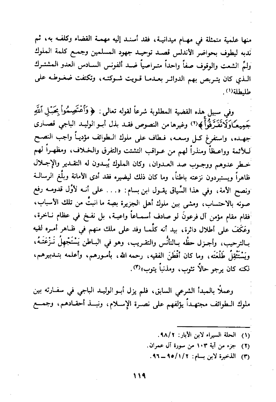 وفي سبيل هذه القضية المطلوبة شرعًا لقوله تعالى: {وَاعْتَصِمُوا بِحَبْلِ اللهِ جَمِيعًا وَلَا تَفَرَّقُوا} (¬2) وغيرها من النصوص فقد بذل أبو الوليد الباجي قصارى جهده، واستفرغ كل وسعه، فطاف على ملوك الطوائف مؤديًا واجب النصح للأئمة وواعظًا ومنذرًا لهم من عواقب التشتت والتفرق والخلاف، ومظهرًا لهم خطر عدوهم ووجوب صد العدوان، وكان الملوك يُبدون له التقدير والإجلال ظاهرًا ويستبردون نزعته باطنًا، وما كان ذلك ليضيره فقد أدى الأمانة وبلَّغ الرسالة ونصح الأمة، وفي هذا السِّياق يقول ابن بسام: ( ... على أنه لأوَّل قدومه رفع صوته بالاحتساب، ومشى بين ملوك أهل الجزيرة بصِلة ما انبتَّ من تلك الأسباب، فقام مقام مؤمن آل فرعونَ لو صادف أسماعًا واعية، بل نفخ في عظام ناخرة، وعَكَفَ على أطلال داثرة، بيد أنه كلَّما وفد على ملك منهم في ظاهر أمره لقيه بالترحيب، وأجزل حظَّه بالتأنُّس والتقريب، وهو في الباطن يَسْتَجْهِلُ نَزْعَتَهُ، ويَسْتَثْقِلُ طَلْعَتَه، وما كان أفْطَنَ الفقيه رحمه الله، بأمورهم، وأعلمه بتدبيرهم، لكنه كان يرجو حالًا تثوب، ومذنبًا يتوب) (¬3).