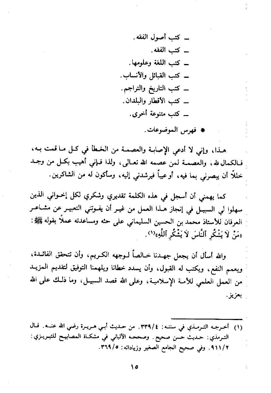 كما يهمني أن أسجل في هذه الكلمة تقديري وشكري لكل إخواني الذين سهلوا لي السبيل في إنجاز هذا العمل من غير أن يفوتني التعبير عن مشاعر العرفان للأستاذ محمد بن الحسين السليماني على حثه ومساعدته عملًا بقوله: (مَنْ لَا يَشْكُرِ النَّاسَ لَا يَشْكُرِ اللَّه) (¬1).
