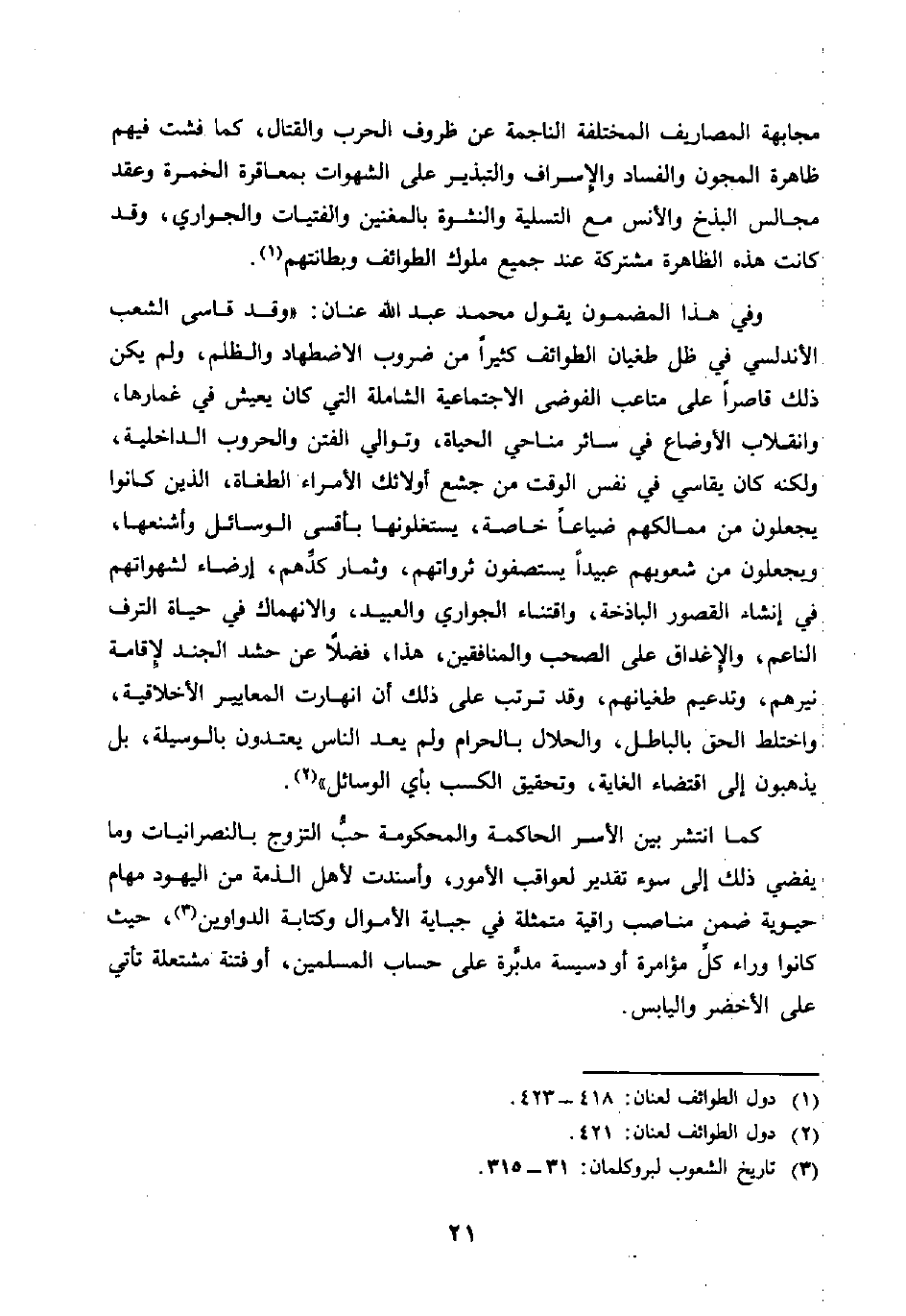 وفي هذا المضمون يقول محمد عبد الله عنان: (وقد قاسى الشعب الأندلسي في ظل طغيان الطوائف كثيرًا من ضروب الاضطهاد والظلم، ولم يكن ذلك قاصرًا على متاعب الفوضى الاجتماعية الشاملة التي كان يعيش في غمارها، وانقلاب الأوضاع في سائر مناحي الحياة، وتوالي الفتن والحروب الداخلية، ولكنه كان يقاسي في نفس الوقت من جشع أولائك الأمراء الطغاة، الذين كانوا يجعلون من ممالكهم ضياعًا خاصة، يستغلونها بأقسى الوسائل وأشنعها، ويجعلون من شعوبهم عبيدًا يستصفون ثرواتهم، وثمار كدِّهم، إرضاء لشهواتهم في إنشاء القصور الباذخة، واقتناء الجواري والعبيد، والانهماك في حياة الترف الناعم، والإغداق على الصحب والمنافقين، هذا، فضلًا عن حشد الجند لإقامة نيرهم، وتدعيم طغيانهم، وقد ترتب على ذلك أن انهارت المعايير الأخلاقية، واختلط الحق بالباطل، والحلال بالحرام ولم يعد الناس يعتدون بالوسيلة، بل يذهبون إلى اقتضاء الغاية، وتحقيق الكسب بأي الوسائل) (¬2).