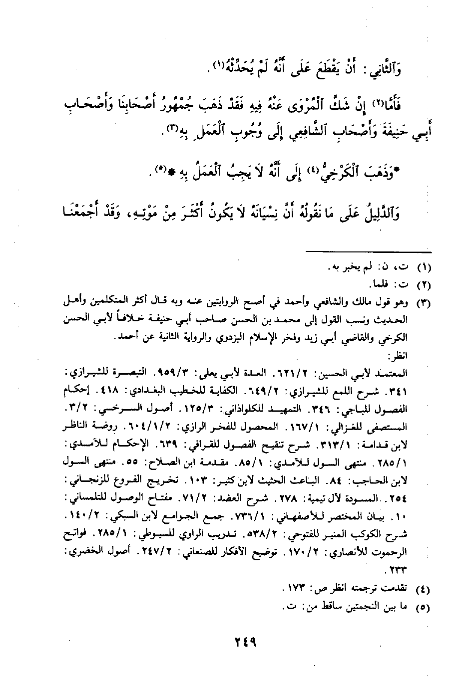 المعتمد لأبي الحسين: 2/ 621. العدة لأبي يعلى: 3/ 959. التبصرة للشيرازي: 341. شرح اللمع للشيرازي: 2/ 649. الكفاية للخطيب البغدادي: 418. إحكام الفصول للباجي: 346. التمهيد للكلواذاني: 3/ 125. أصول السرخسي: 2/ 3. المستصفى للغزالي: 1/ 16. المحصول للفخر الرازي: 2/ 1/ 604. روضة الناظر لابن قدامة: 1/ 313. شرح تنقيح الفصول للقرافي: 639. الإحكام للآمدي: 1/ 285. منتهى السول للآمدي: 1/ 85. مقدمة ابن الصلاح: 55. منتهى السول لابن الحاجب: 84. الباعث الحثيث لابن كثير: 103. تخريج الفروع للزنجاني: 254. المسودة لآل تيمية: 278. شرح العقيد: 2/ 71. مفتاح الوصول للتلمساني: 10. بيان المختصر للأصفهاني: 1/ 736. جمع الجوامع لابن السبكي: 2/ 140. شرح الكوكب المنير للفتوحي: 2/ 535. تدريب الراوي للسيوطي: 1/ 285. فواتح الوحموت للأنصاري: 2/ 170. توضح الأفكار للصنعاني: 2/ 247. أصول الخضري: 233.