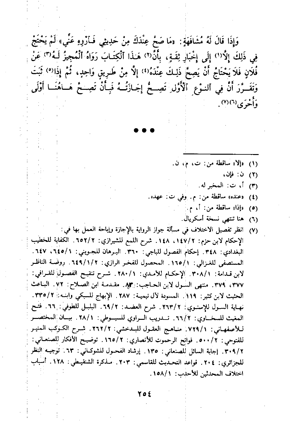 الإحكام لابن حزم: 2/ 147، 148. شرح اللمع للشيرازي: 2/ 652. الكفاية للخطيب البغدادي: 348. إحكام الفصول للباجي: 360. البرهان للجويني: 1/ 645، 647. المستصفى للغزالي: 1/ 165. المحصول للفخر الرازي: 2/ 1/ 649. روضة الناظر لابن قدامة: 1/ 308. الإحكام للآمدي: 1/ 280. شرح تنقيح الفصول للقرافي: 377، 379. منتهى السول لابن الحاجب: 83. مقدمة ابن الصلاح: 72. الباعت الحثيث لابن كثير: 119. المسودة لآل تيمية: 287. الإبهاج للسبكي وابنه: 2/ 335. نهاية السول للإسنوي: 2/ 263. شرح العضد: 2/ 69. البلبل للطوفي: 66. فتح المغيث للسخاوي: 2/ 66. تدريب الراوي للسيوطي: 1/ 28. بيان المختصر للأصفهاني: 1/ 29. مناهج العقول للبدخشي: 2/ 262. شرح الكوكب المنير للفتوحي: 2/ 500. فواتح الرحموت للأنصاري: 2/ 165. توضيح الأفكار للصنعاني: 2/ 309. إجابة السائل للصنعاني: 135. إرشاد الفحول للشوكاني: 63. توجيه النظر للجزائري: 204. قواعد التحديث للقاسمي: 203. مذكرة الشنقيطي: 128. أسباب اختلاف المحدثين للأحدب: 1/ 158.