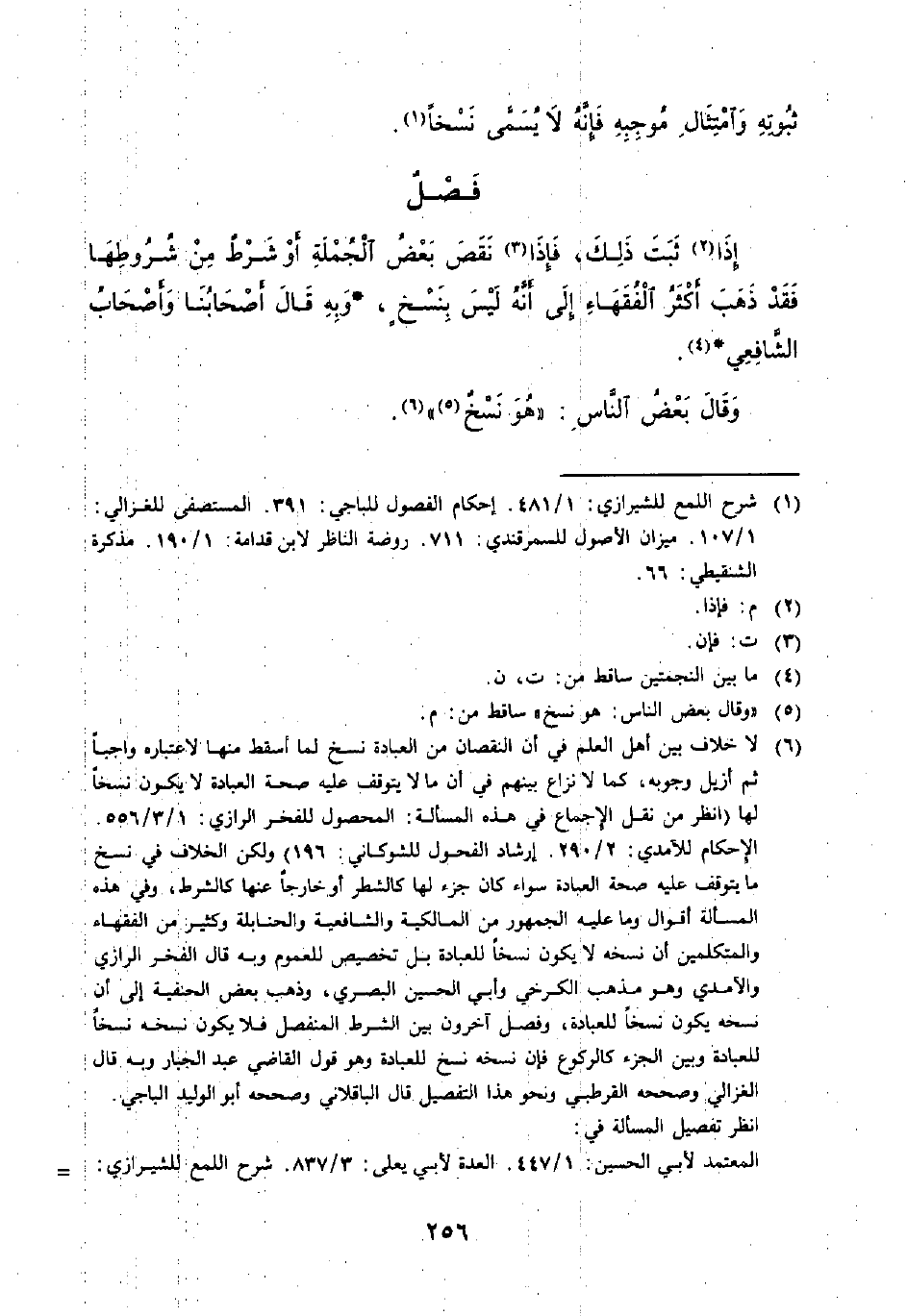 (¬6) لا خلاف بين أهل العلم في أن النقصان من العبادة نسخ لما أسقط منها لاعتباره واجبًا ثم أزيل وجوبه، كما لا نزاع بينهم في أن ما لا يتوقف عليه صحة العبادة لا يكون نسخًا لها (انظر من نقل الإجماع في هذه المسألة: المحصول للفخر الرازي: 1/ 3/ 556. الإحكام للآمدي: 2/ 290. إرشاد الفحول للشوكاني: 196) ولكن الخلاف في نسخ ما يتوقف عليه صحة العبادة سواء كان جزء لها كالشطر أو خارجًا عنها كالشرط، وفي هذه المسألة أقوال وما عليه الجمهور من المالكية والشافعية والحنابلة وكثير من الفقهاء والمتكلمين أن نسخه لا يكون نسخًا للعبادة بل تخصيص للعموم وبه قال الفخر الرازي والآمدي وهو مذهب الكرخي وأبي الحسين البصري، وذهب بعض الحنفية إلى أن نسخه يكون نسخًا للعبادة، وفصل آخرون بين الشرط المفصل فلا يكون نسخه نسخًا للعبادة وبين الجزء كالركوع فإن نسخه نسخ للعبادة وهو قول القاضي عبد الجبار وبه قال الغزالي. وصححه القرطبي ونحو هذا التفصي قال الباقلاني وصححه أو الوليد الباجي انظر تفصيل المسألة في: