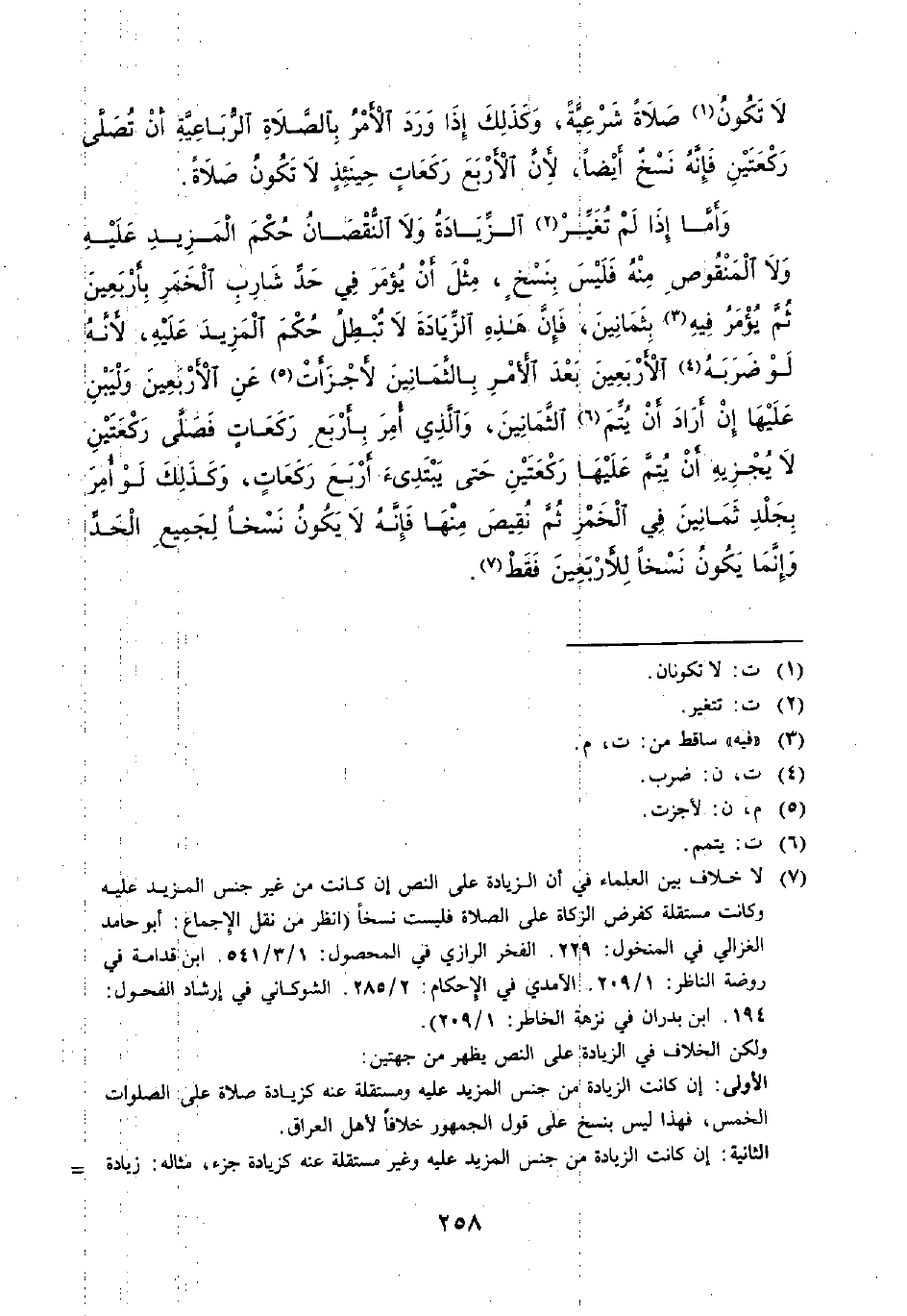 (¬7) لا خلاف بين العلماء في أن الزيادة على النص إن كانت من غير جنس المزيد عليه وكانت مستقلة كفرض الزكاة على الصلاة فليست نسخًا (انظر من نقل الإجماع: أبو حامد الغزالي في المنخول: 229. الفخر الرازي في الحصول: 1/ 3/ 541. ابن قدامة في روضة الناظر: 1/ 209. الآمدي في الإحكام: 2/ 285. الشوكاني في إرشاد الفحول: 194. ابن بدران في نزهة الخاطر: 1/ 209).