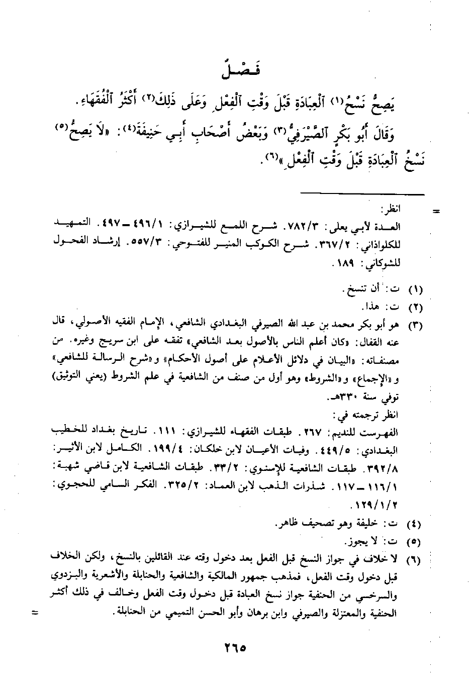 وَقَالَ أَبُو بَكْرِ الصَّيْرَفيُّ (¬3) وَبَعْضُ أَصْحَابِ أَبِي حَنِيفَةَ (¬4): (لَا يَصِحُّ (¬5) نَسْخُ الْعِبَادَةِ قَبْلَ وَقْتِ الْفِعْلِ) (¬6).
