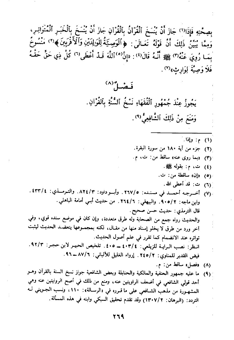 (¬9) ما عليه جمهور الحنفية والمالكية والحنابلة وبعض الشافعية جواز نسخ السنة بالقرآن وهو أحد قولي الشافعي في أضعف الراويتين عنه، ومنع من ذلك في أصح الروايتين عنه وهي المشهورة من مذهب الشافعي على ما قرره في (الرسالة): 110، ونسب الجويني له التردد: (البرهان: 2/ 1307) وقد تقدم تحقيق السبكى وابنه في هذه المسألة.