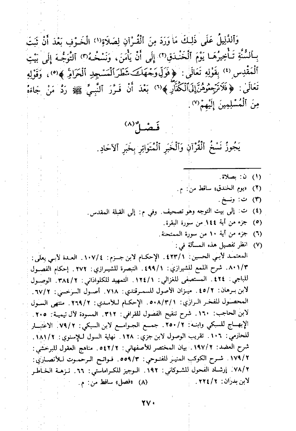 وَالدَّلِيلُ عَلَى ذَلِكَ مَا وَرَدَ مِنْ الْقُرْآنِ لِصَلَاةِ (¬1) الْخَوْفِ بَعْدَ أَنْ ثَبَتَ بِالسُّنَّةِ تَأْخِيرُهَا يَوْمَ الْخَنْدَقِ (¬2) إِلَى أَنْ يَأْمَنَ، وَنَسْخُهُ (¬3) التَّوَجُّهَ إِلَى بَيْتِ الْمَقْدِسِ (¬4) بِقَوْلِهِ تَعَالَى: {فَوَلِّ وَجْهَكَ شَطْرَ الْمَسْجِدِ الْحَرَامِ} (¬5)، وَقَوْلُهُ تَعَالَى: {فَلَا تَرْجِعُوهُنَّ إِلَى الْكُفَّارِ} (¬6) بَعْدَ أَنْ قَرَّرَ النَّبِيُّ - صَلَّى اللَّهُ عَلَيْهِ وَسَلَّمَ - رَدَّ مَنْ جَاءَهُ مِنَ الْمُسْلِمِينَ إِلَيْهِمْ (¬7).