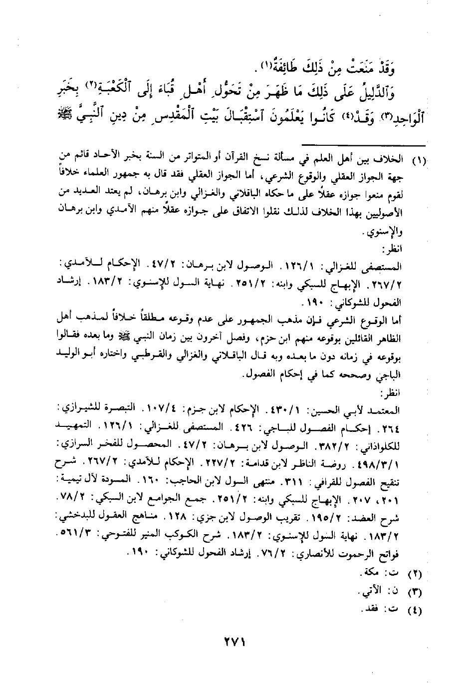 (¬1) الخلاف بين أهل العلم في مسألة نسخ القرآن أو المتواتر من السنة بخبر الآحاد قائم من جهة الجواز العقلي والوقوع الشرعي، أما الجواز العقلي فقد قال به جمهور العلماء خلافًا لقوم منعوا جوازه عقلًا على ما حكاه الباقلاني والغزالي وابن برهان، لم يعتد العديد من الأصوليين بهذا الخلاف لذلك نقلوا الاتفاق على جوازه عقلًا منهم الآمدي وابن برهان والإسنوي.