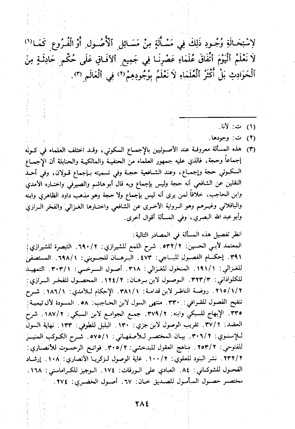 (¬3) هذه المسألة معروفة عند الأصوليين بالإجماع السكوتي، وقد اختلف العلماء في كونه إجماعًا وحجة، فالذي عليه جمهور العلماء من الحنفية والمالكية والحنابلة أن الإجماع السكوتي حجة وإجماع، وعند الشافعية حجة وفي تسميته بإجماع قولان، وفي أحد النقلين عن الشافعي أنه حجة وليس باجماع وبه قال أبو هاشم والصيرفي واختاره الآمدي وابن الحاجب، خلافًا لمن يرى أنه ليس بإجماع ولا حجة وهو مذهب داود الظاهري وابنه والباقلاني وغيرهم وهو الرواية الأخرى عن الشافعي واختارها الغزالي والفخر الرازي وأبو عبد الله البصري، وفي المسألة أقوال أخرى.