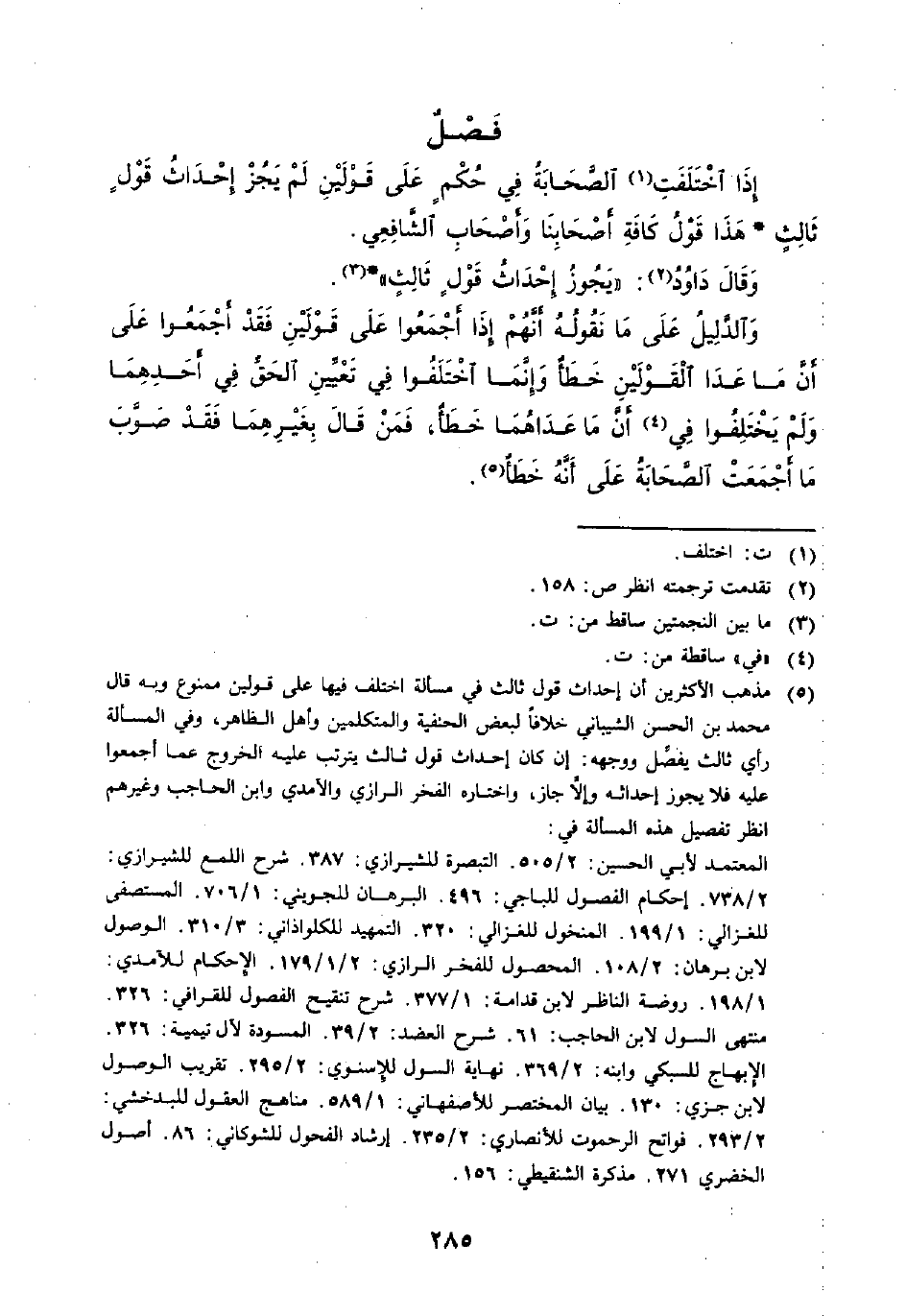 (¬5) مذهب الأكثرين أن إحداث قول ثالث في مسألة اختلف فيها على قولين ممنوع وبه قال محمد بن الحسن الشيباني خلافًا لبعض الحنفية والمتكلمين وأهل الظاهر، وفي المسألة رأي ثالث يفصِّل ووجهه: إن كان إحداث قول ثالث يترتب عليه الخروج عما اجمعوا عليه فلا يجوز إحداثه وإلاَّ جاز، واختاره الفخر الرازي والآمدي وابن الحاجب وغيرهم انظر تفصيل هذه المسألة في: