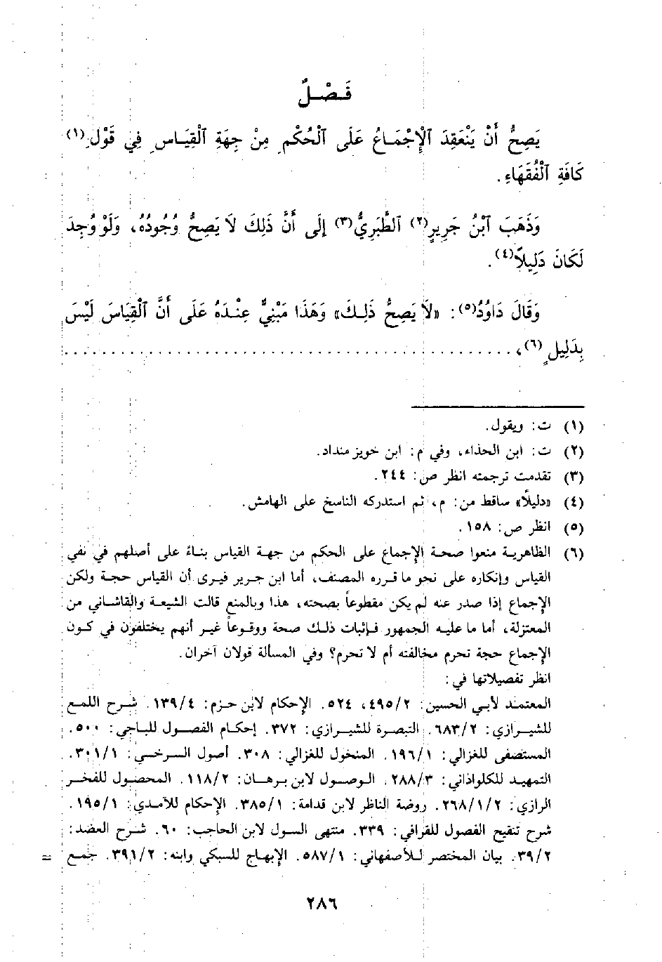 (¬6) الظاهرية منعوا صحة الإجماع على الحكم من جهة القياس بناءًّ على أصلهم في نفي القياس وإنكاره على نحو ما قرره المصنف، أما ابن جرير فيرى أن القياس حجة ولكن الإجماع إذا صدر عنه لم يكن مقطوعًا بصحته، هذا وبالمنع قالت الشيعة والقاشاني من المعتزلة، أما ما عليه الجمهور فإثبات ذلك صحة ووقوعًا غير أنهم يختلفون في كون الإجماع حجة تحرم مخالفته أم لا تحرم؟ وفي المسألة قولان آخران.