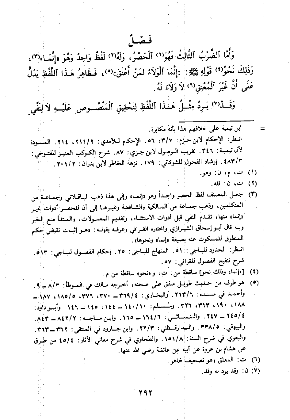 وَأَمَّا الضَّرْبُ الثَّالِثُ فَهُوَ (¬1) الْحَصْرُ، وَلَهُ (¬2) لَفْظٌ وَاحِدٌ وَهُوَ (إِنَمَا) (¬3)، وَذَلِكَ نَحْوُ (¬4) قَوْلِهِ - صَلَّى اللَّهُ عَلَيْهِ وَسَلَّمَ -: (إِنَّمَا الْوَلَاءُ لِمَنْ أَعْتَقَ) (¬5)، فَظَاهِرُ هَذَا اللَّفْظِ يَدُلُّ عَلَى أَنَّ غَيْرَ الْمُعَتَّقِ (¬6) لَا وَلَاءَ لَهُ.
