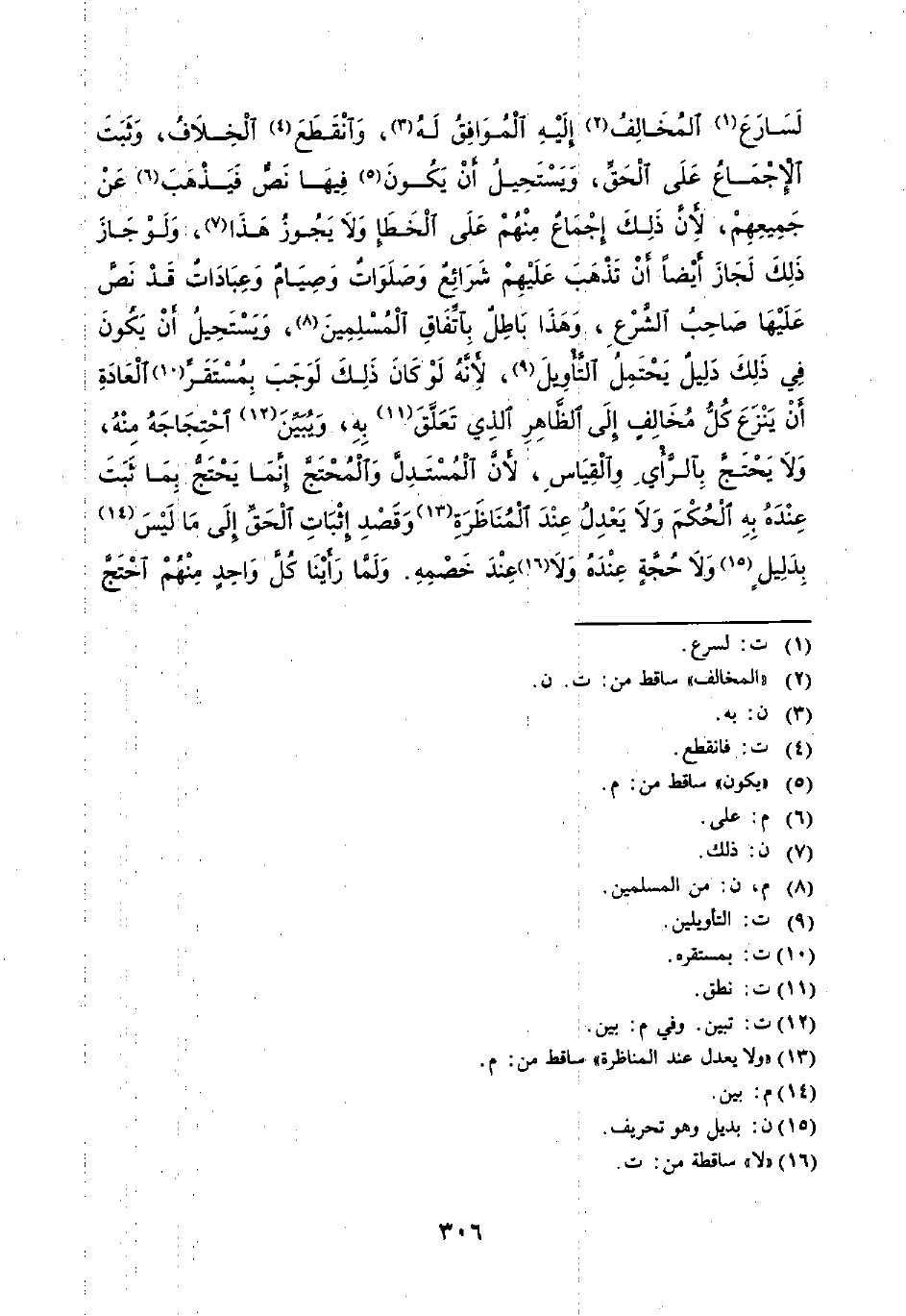 لَسَارَعَ (¬1) الْمُخَالِفُ (¬2) إِلَيْهِ الْمُوَافِقُ لَهُ (¬3)، وَانْقَطَعَ (¬4) الْخِلَافُ، وَثَبَتَ الْإِجْمَاعُ عَلَى الْحَقِّ، وَيسْتَحِيلُ أَنْ يَكُونَ (¬5) فيهَا نَصٌّ فَيَذْهَبَ (¬6) عَنْ جَمِيعِهِمْ، لِأَنَّ ذَلكَ إِجْمَاعٌ مِنْهُمْ عَلَى الْخَطَإِ وَلَا يَجُوزُ هَذَا (¬7)، وَلَوْ جَازَ ذَلكَ لَجَازَ أَيْضًا أَنْ تَذْهَبَ عَلَيْهِمْ شَرَائِعٌ وَصَلَوَاتٌ وَصِيَامٌ وَعِبَادَاتٌ قَدْ نَصَّ عَلَيْهَا صَاحِبُ الشَّرْعِ، وَهَذَا بَاطِلٌ بِاتِّفَاقِ الْمُسْلمِينَ (¬8)، وَيَسْتَحِيلُ أَنْ يَكُونَ في ذَلِكَ دَلِيلٌ يَحْتَمِلُ التَّأْوِيلَ (¬9)، لِأَنَّهُ لَوْ كَانَ ذَلكَ لَوَجَبَ بُمِسْتَقَرِّ (¬10) الْعَادَةِ أَنْ يَنْزَعَ كُلُّ مُخَالِفٍ إِلَى الظَّاهِرِ الذِي تَعَلَّقَ (¬11) بِهِ، وَيُبَيِّنَ (¬12) احْتِجَاجَهُ مِنهُ، وَلَا يَحْتَجَّ بِالرَّأْيِ وَالْقيَاسِ، لِأَنَّ الْمُسْتَدِلَّ وَالْمُحْتَجَّ إنَّمَا يَحْتَجُّ بِمَا ثَبَتَ عِندَهُ بِهِ الْحُكْمَ وَلَا يَعْدِلُ عِنْدَ الْمُنَاظَرَةِ (¬13) وَقَصْدِ إِثْباتِ الْحَقِّ إلَى مَا لَيْسَ (¬14) بِدَلِيلٍ (¬15) وَلَا حُجَّةٍ عِنْدَهُ وَلَا (¬16) عِنْدَ خَصْمِهِ. وَلَمَّا رَأَيْنَا كُلَّ وَاحِدٍ مِنْهُمْ احْتَجَّ