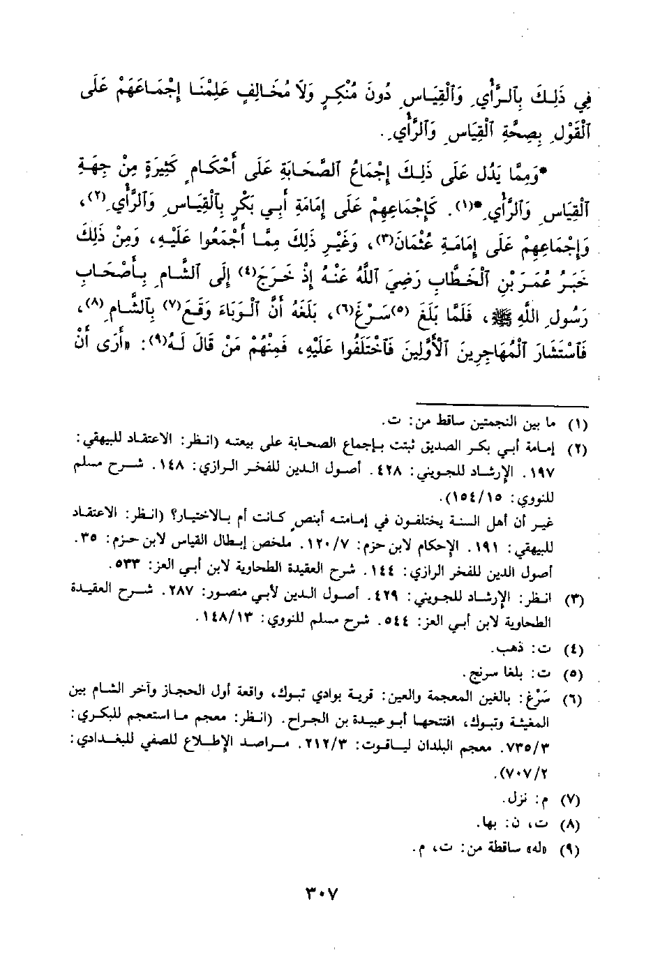 * وَمِمَّا يَدُلُّ عَلَى ذَلِكَ إِجْمَاعُ الصَّحَابَةِ عَلَى أَحْكَامٍ كَثِيرَةٍ مِنْ جِهَةِ الْقِيَاسِ وَالرَّأْيِ * (¬1). كَإِجْمَاعِهِمْ عَلَى إمَامَةِ أَبِي بَكْرٍ بِالْقِيَاسِ وَالرَّأْيِ (¬2)، وَإجْمَاعِهِمْ عَلَى إمَامَةِ عُثْمَانَ (¬3)، وَغَيْرِ ذَلِكَ مِمَّا أَجْمَعُوا عَلَيْهِ، وَمِنْ ذَلِكَ خَبَرُ عُمَرَ بْنِ اْلَخَطَّابِ رَضِيَ اللَّهُ عَنْهُ إِذْ خَرَجَ (¬4) إلَى الشَّامِ بِأَصْحَابِ رَسُولِ اللَّهِ - صَلَّى اللَّهُ عَلَيْهِ وَسَلَّمَ -، فَلَمَّا بَلَغَ (¬5) سَرْغَ (¬6)، بَلَغَهُ أَنَّ الْوَبَاءَ وَقَعَ (¬7) بِالشَّامِ (¬8)، فَاسْتَشَارَ الْمُهَاجِرِينَ الأَوَّلِينَ فَاخْتَلَفُوا عَلَيْه، فَمِنْهُمْ مَنْ قَالَ لَهُ (¬9): (أَرَى أَنْ