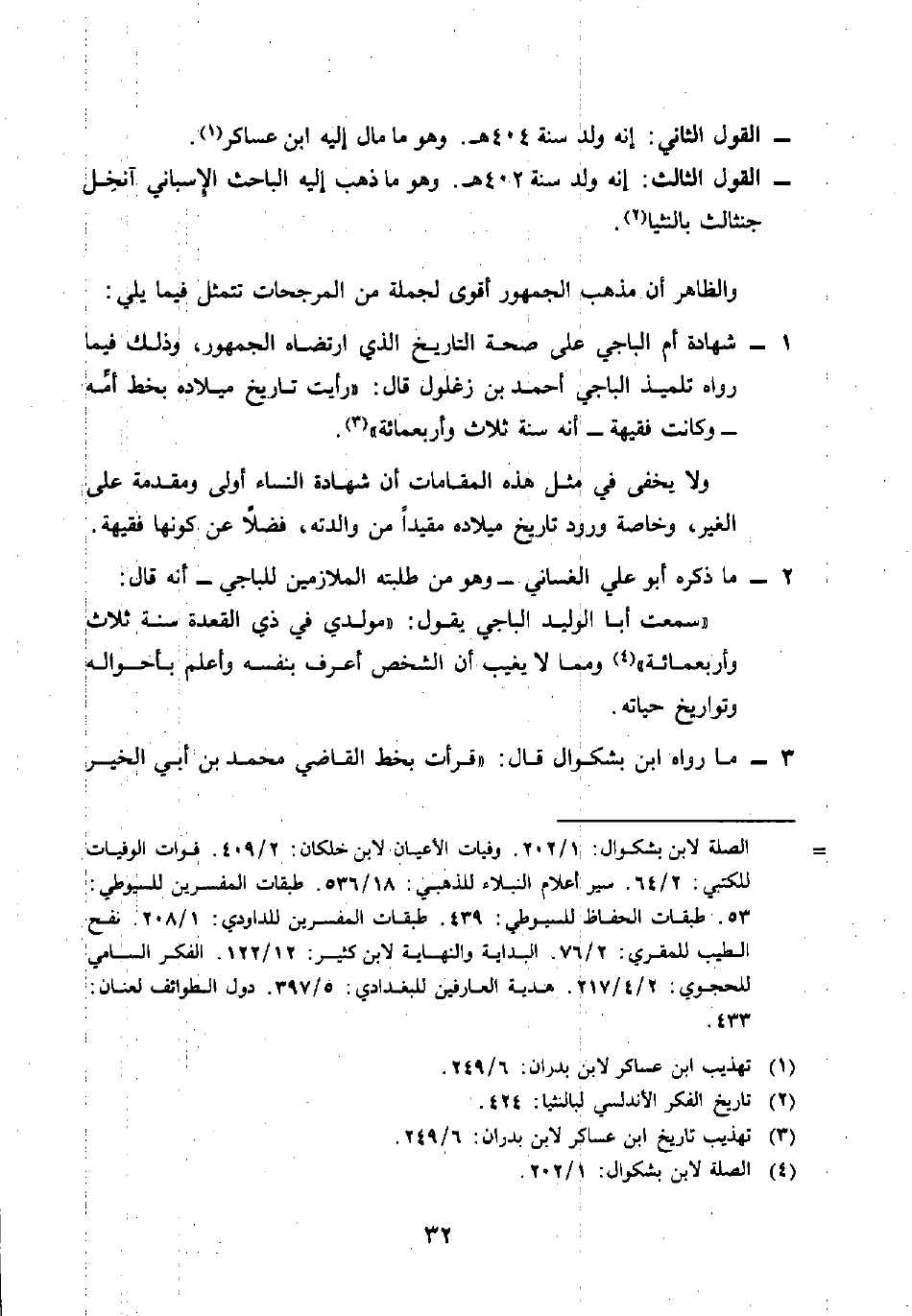 1 - شهادة أم الباجي على صحة التاريخ الذي ارتضاه الجمهور، وذلك فيما رواه تلميذ الباجي أحمد بن زغلول قال: (رأيت تاريخ ميلاده بخط أمِّه - وكانت فقيهة - أنه سنة ثلاث وأربعمائة) (¬3).