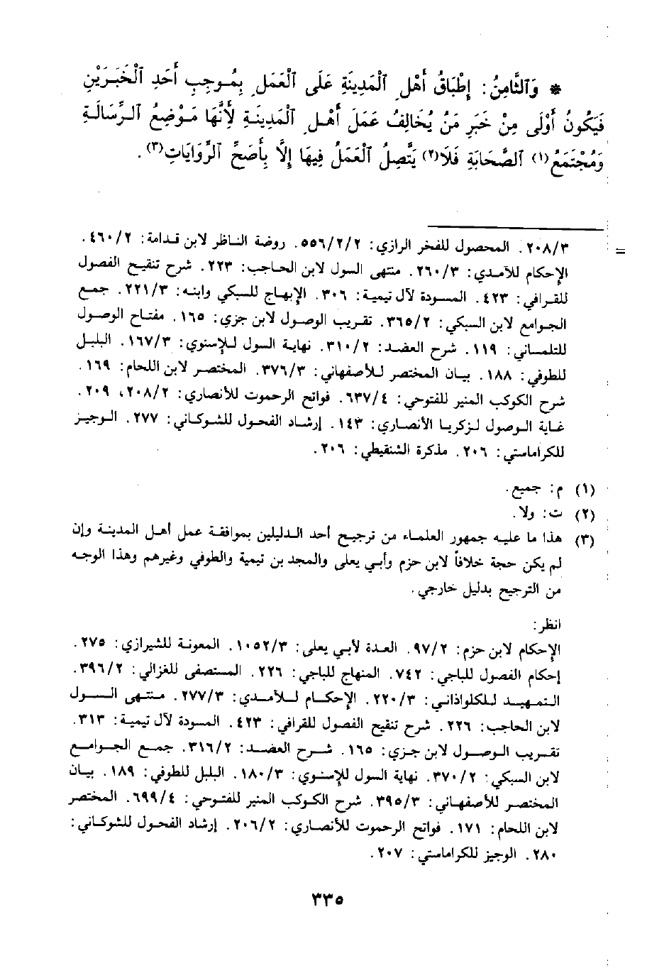(¬3) هذا ما عليه جمهور العلماء من ترجيح أحد الدليلين بموافقة عمل أهل المدينة وإن لم يكن حجة خلافًا لابن حزم وأبي يعلى والمجد بن تيمية والطوفي وغيرهم وهذا الوجه من الترجيح بدليل خارجي.