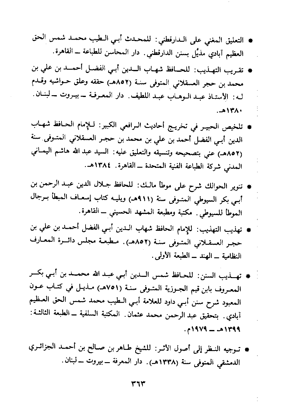 * تقريب التهذيب: للحافظ شهاب الدين أبي الفضل أحمد بن علي بن محمد بن حجر العسقلاني المتوفى سنة (852 هـ) حققه وعلق حواشيه وقدم له: الأستاذ عبد الوهاب عبد اللطيف. دار المعرفة - بيروت - لبنان. 1380 هـ.