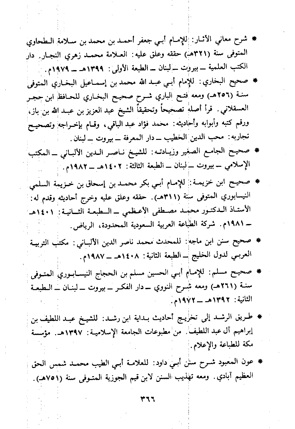 * صحيح البخاري: للإمام أبي عبد الله محمد بن إسماعيل البخاري المتوفى سنة (256 هـ) ومعه فتح الباري شرح صحيح البخاري للحافظ ابن حجر العسقلاني. قرأ أصله تصحيحًا وتحقيقًا الشيخ عبد العزيز بن عبد اله بن باز، ورقم كتبه وأبوابه وأحاديثه: محمد فؤاد عبد الباقي، وقام بإخراجه وتصحيح تجاربه: محب الدين الخطيب - دار المعرفة - بيروت - لبنان.