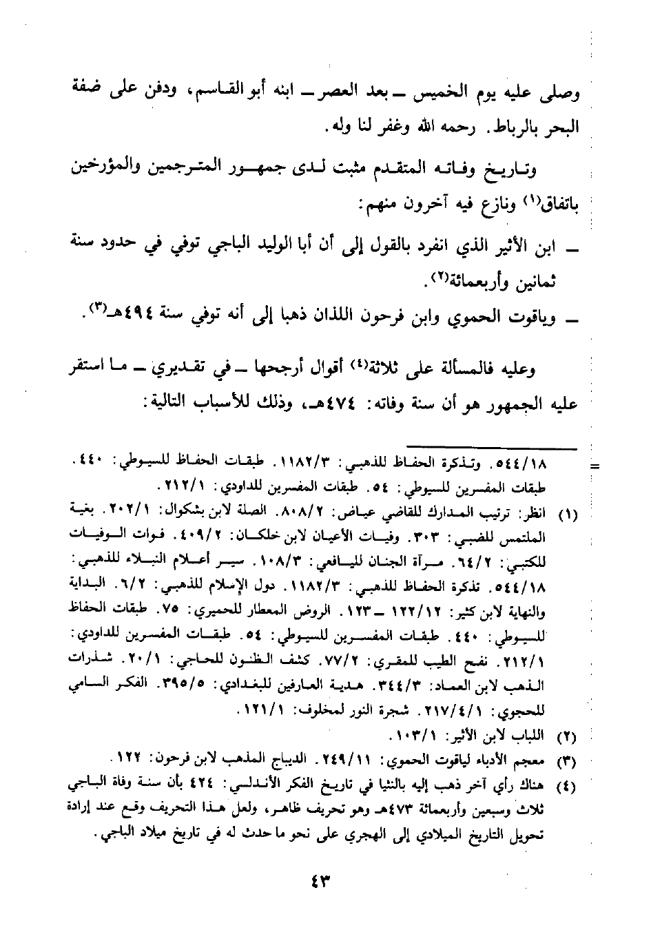 (¬4) هناك رأي آخر ذهب إليه بالنثيا في تاريخ الفكر الأندلسي: 424 بأن سنة وفاة الباجي ثلاث وسبعين وأربعمائة 473 هـ وهو تحريف ظاهر، ولعل هذا التحريف وقع عند إرادة تحويل التاريخ الميلادي إلى الهجري على نحو ما حدث له في تاريخ ميلاد الباجي.