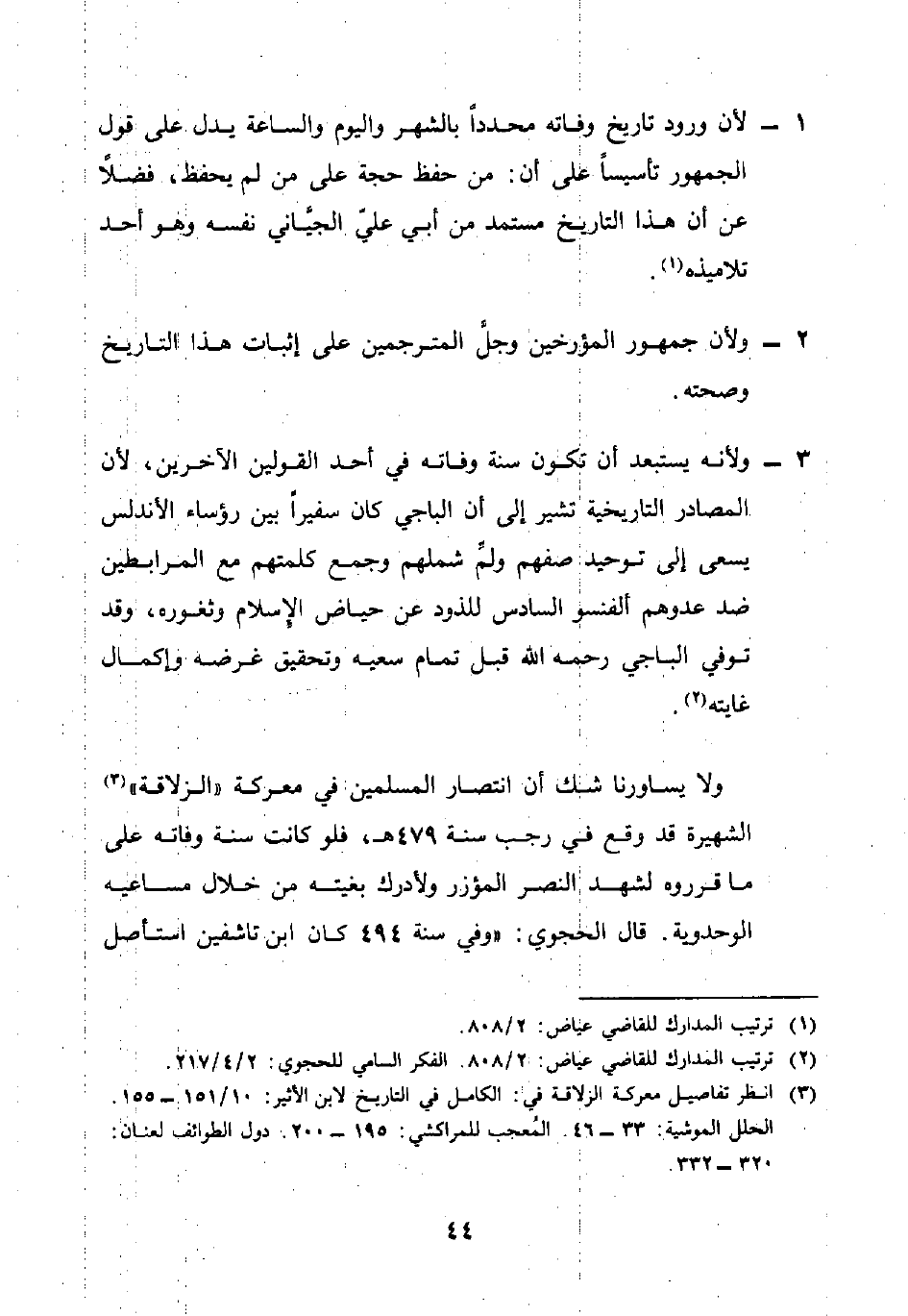 3 - ولأنه يستبعد أن تكون سنة وفاته في أحد القولين الآخرين، لأن المصادر التاريخية تشير إلى أن الباجي كان سفيرًا بين رؤساء الأندلس يسعى إلى توحيد صفهم ولمِّ شملهم وجمع كلمتهم مع المرابطين ضد عدوهم ألفنسو السادس للذود عن حياض الإسلام وثغوره، وقد توفي الباجي رحمه الله قبل تمام سعيه وتحقيق غرضه وإكمال غايته (¬2).