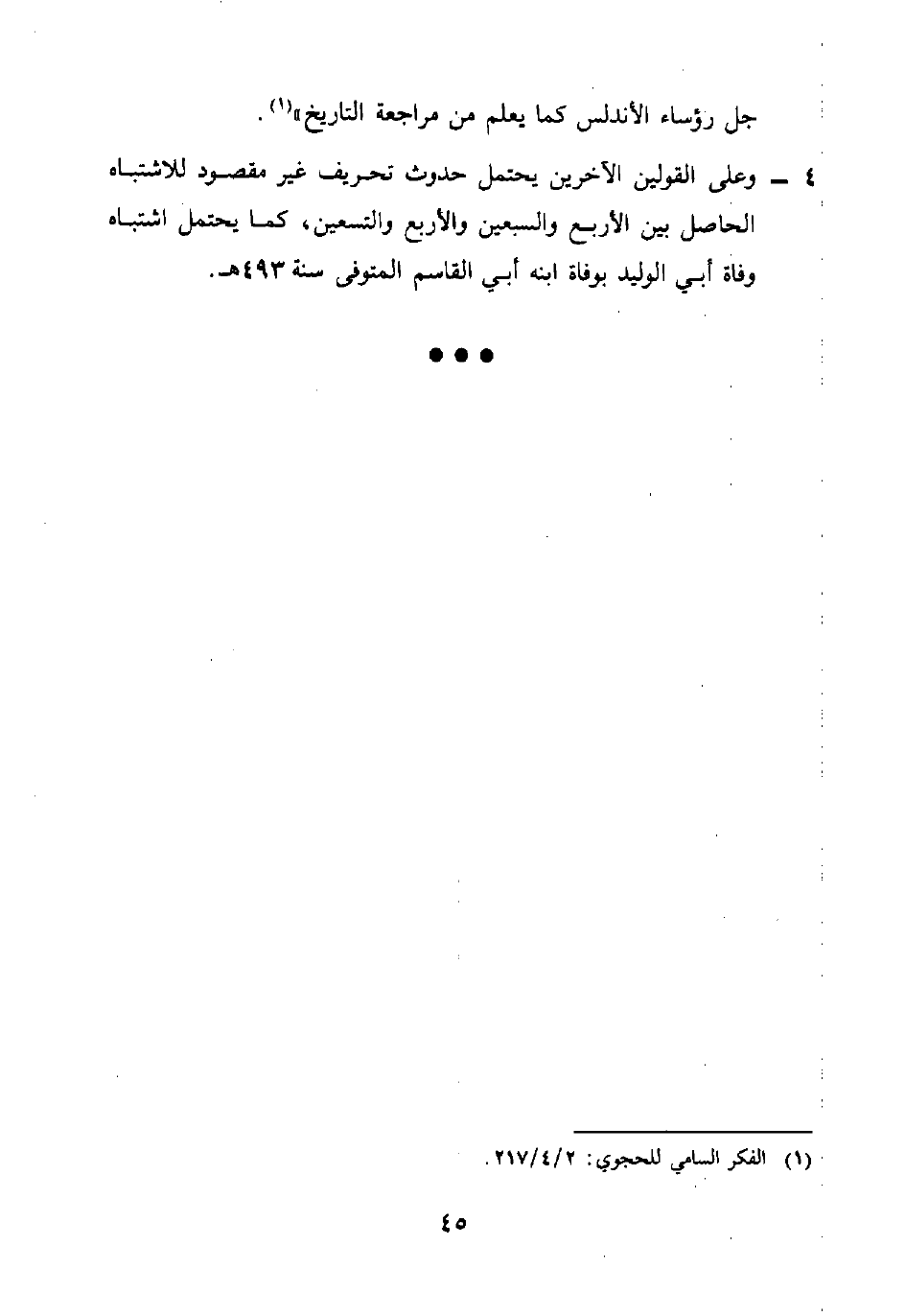 4 - وعلى القولين الآخرين يحتمل حدوث تحريف غير مقصود للاشتباه الحاصل بين الأربِع والسبعين والأربع والتسعين، كما يحتمل اشتباه وفاة أبي الوليد بوفاة ابنه أبي القاسم المتوفى سنة 493 هـ.
