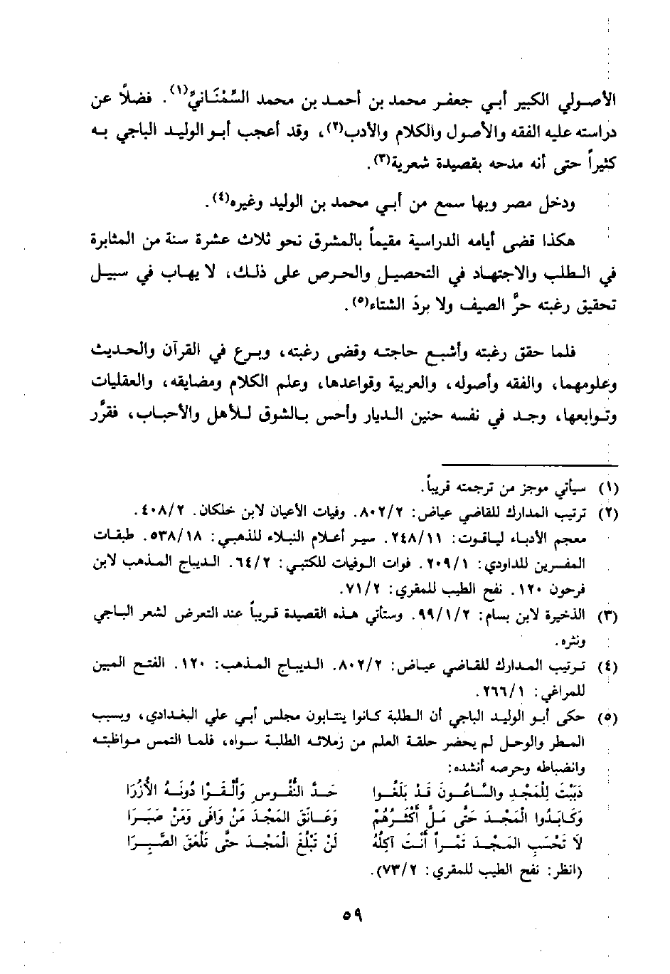 الأصولي الكبير أبي جعفر محمد بن أحمد بن محمد السِّمْنَانيِّ (¬1). فضلًا عن دراسته عليه الفقه والأصول والكلام والأدب (¬2)، وقد أعجب أبو الوليد الباجي به كثيرًا حتى أنه مدحه بقصيدة شعرية (¬3).