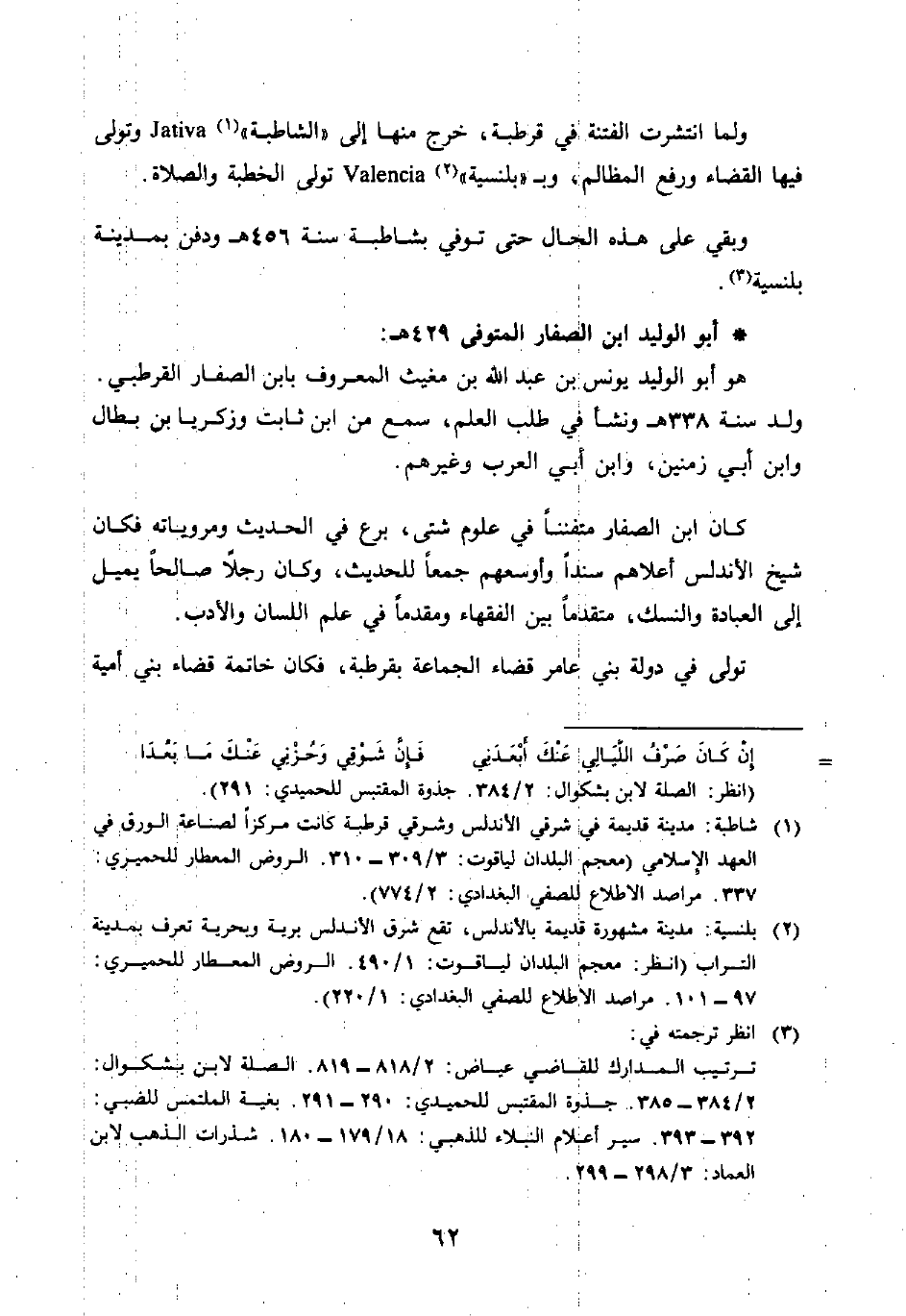 (¬2) بلنسية: مدينة مشهورة قديمة بالأندلس، تقع شرق الأندلس برية وبحرية تعرف بمدينة التراب (انظر: معجم البلدان لياقوت: 1/ 490. الروض المعطار للحميري: 97 - 101. مراصد الاطلاع للصفي البغدادي: 1/ 220).