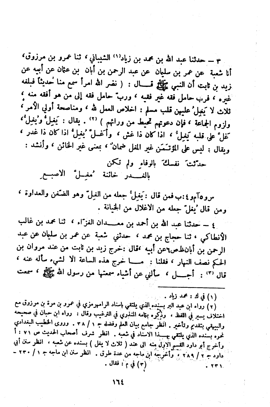 3 - حَدَّثَنَا عَبْدُ اللَّهِ بْنُ مُحَمَّدِ بْنِ زِيَادٍ الشَّيْبَانِيُّ، ثَنَا عُمَرُو بْنُ مَرْزُوقٍ، أنا شُعْبَةُ، عَنْ عُمَرَ بْنِ سُلَيْمَانَ، عَنْ عَبْدِ الرَّحْمَنِ بْنِ أَبَانَ بْنِ عُثْمَانَ، عَنْ أَبِيهِ، عَنْ زَيْدِ بْنِ ثَابِتٍ، أَنَّ النَّبِيَّ صَلَّى اللهُ عَلَيْهِ وَسَلَّمَ، قَالَ: " §نَضَّرَ اللَّهُ امْرَأً سَمِعَ مِنَّا حَدِيثًا فَبَلَّغَهُ غَيْرَهُ، فَرُبَّ حَامِلِ فِقْهٍ غَيْرُ فَقِيهٍ، وَرُبَّ حَامِلِ فِقْهٍ إِلَى مَنْ هُوَ أَفْقَهُ مِنْهُ، ثَلَاثٌ لَا يَغِلُّ عَلَيْهِنَّ قَلْبُ مُسْلِمٍ: إِخْلَاصُ الْعَمَلِ لِلَّهِ، وَمُنَاصَحَةُ أُولِي الْأَمْرِ، وَلُزُومُ الْجَمَاعَةِ، فَإِنَّ دَعْوَتَهُمْ تُحِيطُ مَنْ وَرَاءَهُمْ" يُقَالُ: يَغِلُّ وَيُغِلُّ، غَلَّ عَلَى قَلْبِهِ يَغِلُّ، إِذَا كَانَ ذَا غِشٍّ، وَأَغَلَّ يُغِلُّ إِذَا كَانَ ذَا غَدْرٍ، وَيُقَالُ: لَيْسَ عَلَى الْمُؤْتَمِنِ غَيْرِ الْمُغِلِّ ضَمَانٌ بِمَعْنَى: غَيْرِ الْخَائِنِ، وَأَنْشَدَ: