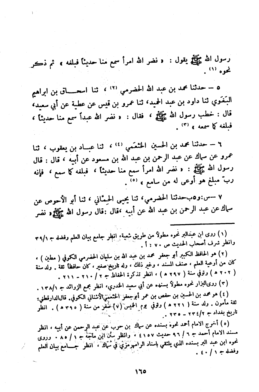 5 - حَدَّثَنَا مُحَمَّدُ بْنُ عَبْدِ اللَّهِ الْحَضْرَمِيُّ، ثَنَا إِسْحَاقُ بْنُ إِبْرَاهِيمَ الْبَغَوِيُّ، ثَنَا دَاوُدُ بْنُ عَبْدِ الْحَمِيدِ، ثَنَا عَمْرُو بْنُ قَيْسٍ، عَنْ عَطِيَّةَ، عَنْ أَبِي سَعِيدٍ قَالَ: خَطَبَ رَسُولُ اللَّهِ صَلَّى اللهُ عَلَيْهِ وَسَلَّمَ فَقَالَ: «§نَضَّرَ اللَّهُ عَبْدًا سَمِعَ مِنَّا حَدِيثًا فَبَلَّغَهُ كَمَا سَمِعَهُ»