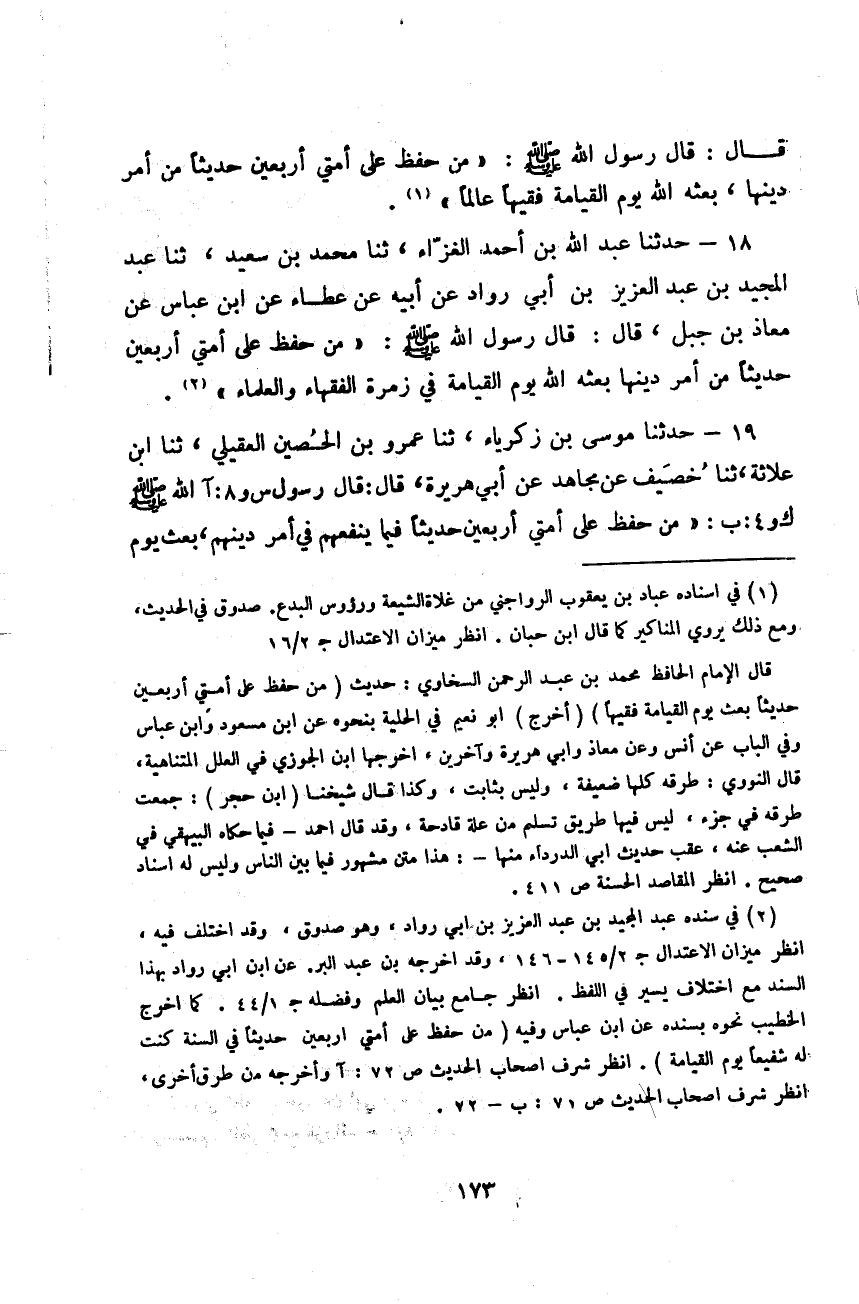 18 - حَدَّثَنَا عَبْدُ اللَّهِ بْنُ أَحْمَدَ الْغَزَّاءُ، ثَنَا مُحَمَّدُ بْنُ سَعِيدٍ، ثَنَا عَبْدُ الْمَجِيدِ بْنُ عَبْدِ الْعَزِيزِ بْنِ أَبِي رَوَّادٍ، عَنْ أَبِيهِ، عَنْ عَطَاءٍ، عَنِ ابْنِ عَبَّاسٍ، عَنْ مُعَاذِ بْنِ جَبَلٍ قَالَ: قَالَ رَسُولُ اللَّهِ صَلَّى اللهُ عَلَيْهِ وَسَلَّمَ: «§مَنْ حَفِظَ عَلَى أُمَّتِي أَرْبَعِينَ حَدِيثًا مِنْ أَمْرِ دِينِهَا، بَعَثَهُ اللَّهُ يَوْمَ الْقِيَامَةِ فِي زُمْرَةِ الْفُقَهَاءِ وَالْعُلَمَاءِ»