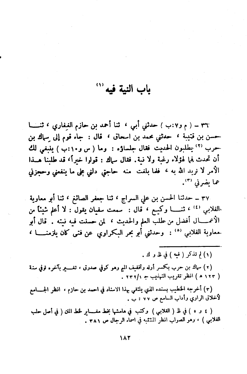 حَدَّثَنَا الْحَسَنُ بْنُ عَلِيٍّ السَّرَّاجُ، ثَنَا جَعْفَرُ الصَّائِغُ، ثَنَا أَبُو مُعَاوِيَةَ الْفَلَّابِي، ثَنَا وَكِيعٌ، قَالَ: سَمِعْتُ سُفْيَانَ يَقُولُ: «§لَا أَعْلَمُ شَيْئًا مِنَ الْأَعْمَالِ أَفْضَلَ مِنْ طَلَبِ الْعِلْمِ وَالْحَدِيثِ، لِمَنْ حَسُنَتْ فِيهِ نِيَّتُهُ»
