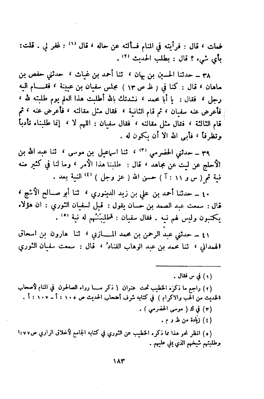 حَدَّثَنِي عَبْدُ الرَّحْمَنِ بْنُ مُحَمَّدٍ الْمَازِنِيُّ، ثَنَا هَارُونُ بْنُ إِسْحَاقَ الْهَمْدَانِيُّ، ثَنَا مُحَمَّدُ بْنُ عَبْدِ الْوَهَّابِ الْقَنَّادُ قَالَ: سَمِعْتُ سُفْيَانَ الثَّوْرِيَّ -[184]- يَقُولُ: «§لَوْ عَلِمْتُ أَنَّ أَحَدًا يَطْلُبُ الْحَدِيثَ لِلَّهِ، لَصِرْتُ إِلَيْهِ فِي بَيْتِهِ فَحَدَّثْتُهُ»