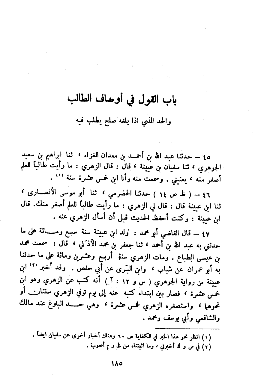 حَدَّثَنَا الْحَضْرَمِيُّ، ثَنَا أَبُو مُوسَى الْأَنْصَارِيُّ، ثَنَا ابْنُ عُيَيْنَةَ قَالَ: قَالَ لِي الزُّهْرِيُّ: «§مَا رَأَيْتُ طَالِبًا لِلْعِلْمِ أَصْغَرَ مِنْكَ» قَالَ ابْنُ عُيَيْنَةَ: «وَكُنْتُ أَحْفَظُ الْحَدِيثَ قَبْلَ أَنْ أَسْأَلَ الزُّهْرِيَّ عَنْهُ» قَالَ الْقَاضِي أَبُو مُحَمَّدٍ: وُلِدَ ابْنُ عُيَيْنَةَ سَنَةَ سَبْعٍ وَمِائَةٍ عَلَى مَا حَدَّثَنِي بِهِ عَبْدُ اللَّهِ بْنُ أَحْمَدَ، ثَنَا جَعْفَرُ بْنُ مُحَمَّدٍ الْأَذَنِيُّ، قَالَ: سَمِعْتُ مُحَمَّدَ بْنَ عِيسَى الطَّبَّاعَ وَمَاتَ الزُّهْرِيُّ سَنَةَ أَرْبَعٍ وَعِشْرِينَ وَمِائَةٍ عَلَى مَا حَدَّثَنَا بِهِ أَبُو عِمْرَانَ عَنْ شَبَابٍ، وَابْنِ الْبُرِّيِّ عَنْ أَبِي حَفْصٍ وَقَدْ أَخْبَرَ ابْنُ عُيَيْنَةَ مِنْ رِوَايَةِ الْجَوْهَرِيِّ، أَنَّهُ كَتَبَ عَنِ الزُّهْرِيِّ وَهُوَ ابْنُ خَمْسَ عَشْرَةَ، فَصَارَ بَيْنَ ابْتِدَاءِ كَتْبِهِ عَنْهُ إِلَى يَوْمِ تُوُفِّيَ الزُّهْرِيُّ سُنَّتَانِ أَوْ نَحْوُهُمَا، وَاسْتَصْغَرَهُ الزُّهْرِيُّ لِخَمْسَ عَشْرَةَ، وَهِيَ حَدُّ الْبُلُوغِ عِنْدَ مَالِكٍ وَالشَّافِعِيِّ وَأَبِي يُوسُفَ وَمُحَمَّدٍ -[186]- وَحَكَى لِي حَاكٍ أَنَّ الْأَوْزَاعِيَّ سُئِلَ عَنِ الْغُلَامِ: يَكْتُبُ الْحَدِيثَ قَبْلَ أَنْ يَبْلُغَ الْحَدَّ الَّذِي تَجْرِي عَلَيْهِ فِيهِ الْأَحْكَامُ؟ فَقَالَ: إِذَا ضَبَطَ الْإِمْلَاءِ جَازَ سَمَاعُهُ، وَإِنْ كَانَ دُونَ الْعَشْرِ، وَاحْتَجَّ بِحَدِيثِ سَبْرَةَ بْنِ مَعْبَدٍ أَنَّ النَّبِيَّ صَلَّى اللهُ عَلَيْهِ وَسَلَّمَ قَالَ: «مُرُوا أَوْلَادَكُمْ بِالصَّلَاةِ لِسَبْعٍ، وَاضْرِبُوهُمْ عَلَيْهَا لِعَشْرٍ» وَهَذِهِ حِكَايَةٌ عَنِ الْأَوْزَاعِيِّ، وَلَا أَعْرِفُ صِحَّتَهَا، إِلَّا أَنَّهَا صَحِيحَةُ الِاعْتِبَارِ، لِأَنَّ الْأَمْرَ بِالصَّلَاةِ وَالضَّرْبِ عَلَيْهَا إِنَّمَا هُوَ عَلَى وَجْهِ الرِّيَاضَةِ، لَا عَلَى وَجْهِ الْوجُوبِ، وَكَذَلِكَ كَتْبُ الْحَدِيثِ إِنَّمَا هُوَ لِلِقَاءِ وَتَحْصِيلِ السَّمَاعِ، وَإِذَا كَانَ هَذَا هَكَذَا، فَلَيْسَ الْمُعْتَبَرُ فِي كَتْبِ الْحَدِيثِ الْبُلُوغَ وَلَا غَيْرَهُ، بَلْ تُعْتَبَرُ فِيهِ الْحَرَكَةُ وَالنَّضَاجَةُ وَالتَّيَقُّظُ وَالضَّبْطُ، وَقَدْ دَلَّ قَوْلُ الزُّهْرِيِّ: «مَا رَأَيْتُ طَالِبًا لِلْعِلْمِ أَصْغَرَ مِنِ ابْنِ عُيَيْنَةَ» عَلَى أَنَّ طُلَّابَ الْحَدِيثِ عَصْرَ التَّابِعِينَ كَانُوا فِي حُدُودِ الْعِشْرِينَ، وَكَذَلِكَ يُذْكَرُ عَنْ أَهْلِ الْكُوفَةِ، فَأَخْبَرَنِي عِدَّةٌ مِنْ شُيُوخِنَا أَنَّهُ قِيلَ لِمُوسَى بْنِ إِسْحَاقَ: كَيْفَ لَمْ تُكْتَبْ عَنْ أَبِي نُعَيْمٍ؟ قَالَ: كَانَ أَهْلُ الْكُوفَةِ لَا يُخْرِجُونَ أَوْلَادَهُمْ فِي طَلَبِ الْعِلْمِ صِغَارًا حَتَّى يَسْتَكْمِلُوا عِشْرِينَ سَنَةً وَحَدَّثَنِي مَنْ ذُكِرَ أَنَّهُ سَمِعَ مُحَمَّدَ بْنَ عَبْدِ اللَّهِ الْحَضْرَمِيَّ يَقُولُ ذَلِكَ أَيْضًا وَوُلِدَ الْحَضْرَمِيُّ سَنَةَ مِائَتَيْنِ، وَمَاتَ أَبُو نُعَيْمٍ سَنَةَ تِسْعَ عَشْرَةَ