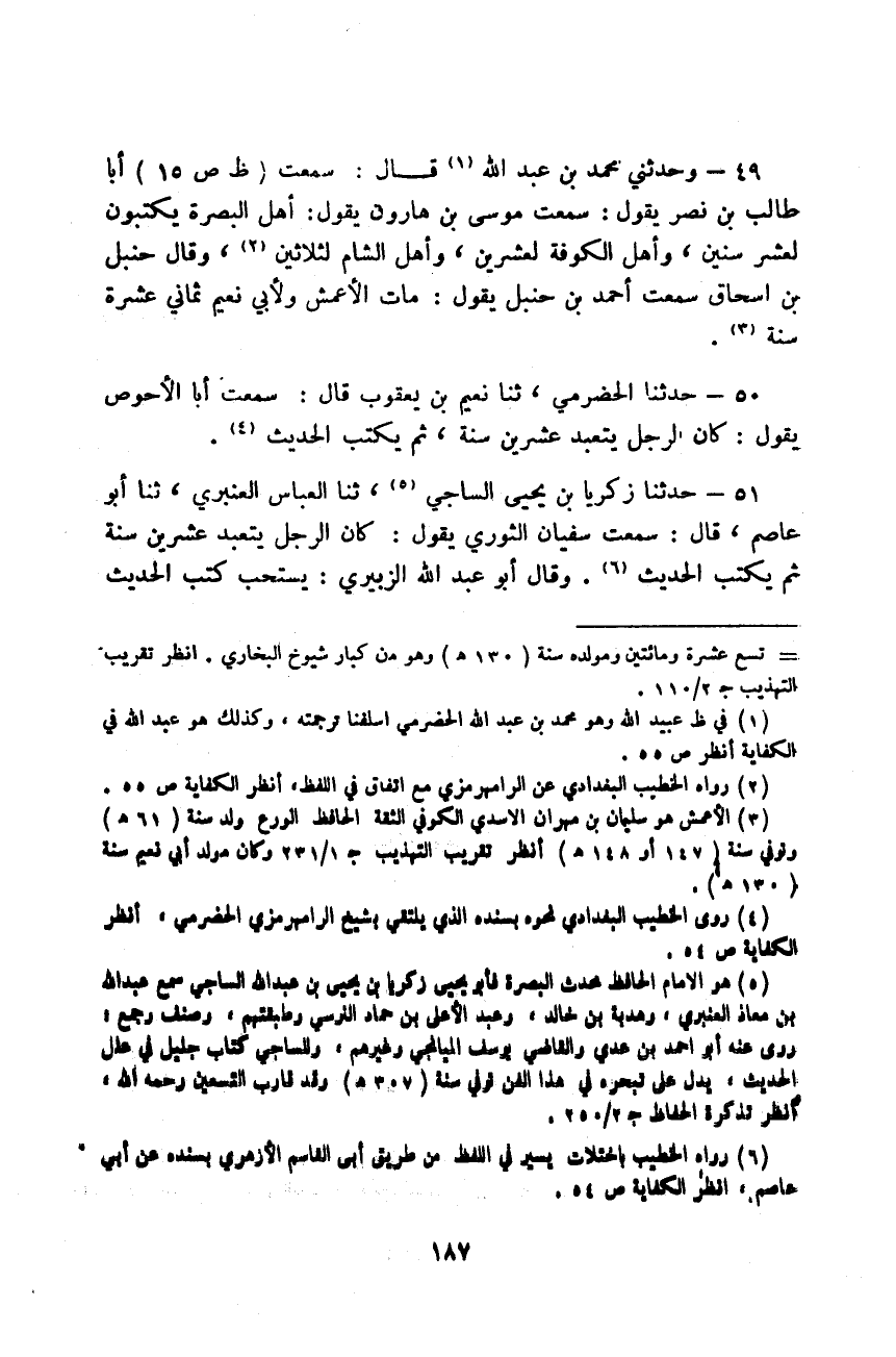 حَدَّثَنَا زَكَرِيَّا بْنُ يَحْيَى السَّاجِيُّ، ثَنَا الْعَبَّاسُ الْعَنْبَرِيُّ، ثَنَا أَبُو عَاصِمٍ قَالَ: سَمِعْتُ سُفْيَانَ الثَّوْرِيَّ يَقُولُ: «كَانَ §الرَّجُلُ يَتَعَبَّدُ عِشْرِينَ سَنَةً، ثُمَّ يَكْتُبُ الْحَدِيثَ»