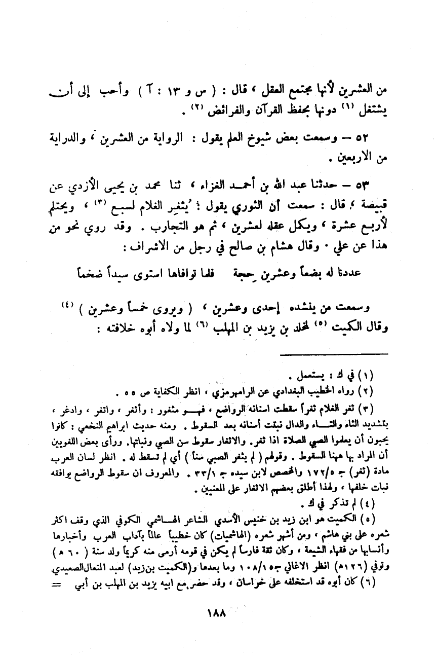 وَسَمِعْتُ بَعْضَ شُيُوخِ الْعِلْمِ يَقُولُ: «§الرِّوَايَةُ مِنَ الْعِشْرِينَ، وَالدِّرَايَةُ مِنَ الْأَرْبَعِينَ»