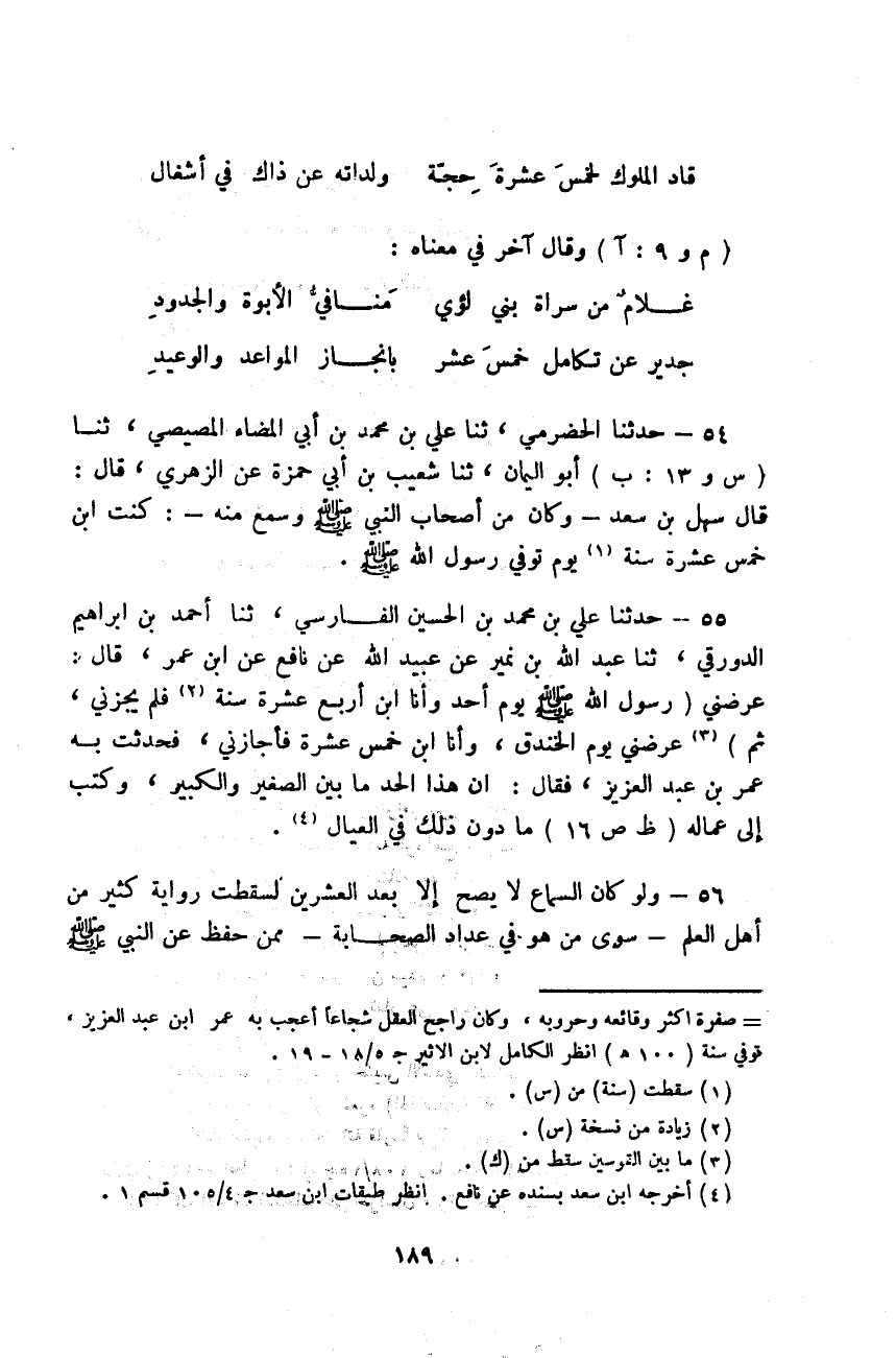 حَدَّثَنَا عَلِيُّ بْنُ مُحَمَّدِ بْنِ الْحُسَيْنِ الْفَارِسِيُّ، ثَنَا أَحْمَدُ بْنُ إِبْرَاهِيمَ الدَّوْرَقِيُّ، ثَنَا عَبْدُ اللَّهِ بْنُ نُمَيْرٍ، عَنْ عُبَيْدِ اللَّهِ، عَنْ نَافِعٍ، عَنِ ابْنِ عُمَرَ قَالَ: §عَرَضَنِي رَسُولُ اللَّهِ صَلَّى اللهُ عَلَيْهِ وَسَلَّمَ يَوْمَ أُحُدٍ، وَأَنَا ابْنُ أَرْبَعَ عَشْرَةَ سَنَةً، فَلَمْ يُجِزْنِي، ثُمَّ عَرَضَنِي يَوْمَ الْخَنْدَقِ، وَأَنَا ابْنُ خَمْسَ عَشْرَةَ فَأَجَازَنِي " فَحَدَّثْتُ بِهِ عُمَرَ بْنَ عَبْدِ الْعَزِيزِ، فَقَالَ: إِنَّ هَذَا الْحَدَّ مَا بَيْنَ الصَّغِيرِ وَالْكَبِيرِ، وَكَتَبَ إِلَى عُمَّالِهِ مَا دُونَ ذَلِكَ فِي الْعِيَالِ وَلَوْ كَانَ السَّمَاعُ لَا يَصِحُّ إِلَّا بَعْدَ الْعِشْرِينَ لَسَقَطَتْ رِوَايَةُ كَثِيرٍ مِنْ أَهْلِ الْعِلْمِ، سِوَى مَنْ هُوَ فِي عِدَادِ الصَّحَابَةِ، مِمَّنْ حَفِظَ، عَنِ النَّبِيِّ صَلَّى اللهُ عَلَيْهِ وَسَلَّمَ -[190]-، وَهُوَ صَغِيرٌ، وُلِدَ الْحَسَنُ بْنُ عَلِيٍّ سَنَةَ اثْنَتَيْنِ مِنَ الْهِجْرَةِ، وَقَدْ حَفِظَ عَنِ النَّبِيِّ صَلَّى اللهُ عَلَيْهِ وَسَلَّمَ، وَهُوَ أَوَّلُ مَوْلُودٌ وُلِدَ فِي الْإِسْلَامِ مِنَ الْمُهَاجِرِينَ، وَقَدْ قِيلَ: أَوَّلُ مَوْلُودٍ عَبْدُ اللَّهِ بْنُ الزُّبَيْرِ، وَبَيْنَ الْحَسَنِ وَالْحُسَيْنِ عَلَيْهِمَا السَّلَامُ طُهْرٌ وَاحِدٌ، عَلَى مَا حَدَّثَنِي بِهِ أَبِي