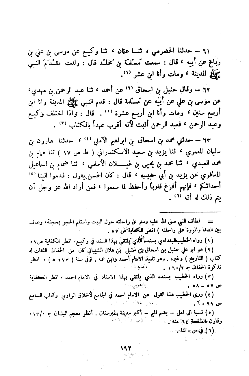 وَقَالَ حَنْبَلُ بْنُ إِسْحَاقَ، عَنْ أَحْمَدَ، ثَنَا عَبْدُ الرَّحْمَنِ بْنُ مَهْدِيٍّ، عَنْ مُوسَى بْنِ عَلِيٍّ، عَنْ أَبِيهِ، عَنْ مَسْلَمَةَ قَالَ: «§قَدِمَ النَّبِيُّ صَلَّى اللهُ عَلَيْهِ وَسَلَّمَ الْمَدِينَةَ، وَأَنَا ابْنُ أَرْبَعِ سِنِينَ، وَمَاتَ وَأَنَا ابْنُ أَرْبَعَ عَشْرَةَ» قَالَ: وَإِذَا اخْتَلَفَ وَكِيعٌ وَعَبْدُ الرَّحْمَنِ، فَعَبْدُ الرَّحْمَنِ أَثْبَتُ لِأَنَّهُ أَقْرَبُ عَهْدًا بِالْكِتَابِ