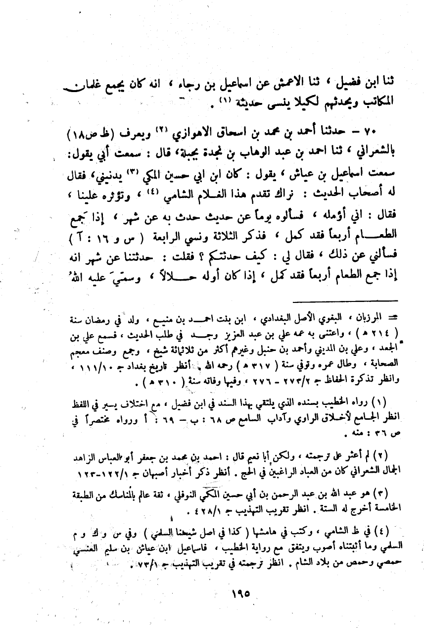 حَدَّثَنَا أَحْمَدُ بْنُ مُحَمَّدِ بْنِ إِسْحَاقَ الْأَهْوَازِيُّ وَيُعْرَفُ بِالشَّعْرَانِيِّ، ثَنَا أَحْمَدُ بْنُ عَبْدِ الْوَهَّابِ بْنِ نَجْدَةَ، بِجَبَلَةَ، قَالَ: سَمِعْتُ أَبِي يَقُولُ: سَمِعْتُ إِسْمَاعِيلَ بْنَ عَيَّاشٍ يَقُولُ: كَانَ ابْنُ أَبِي حُسَيْنٍ الْمَكِّيُّ يُدْنِينِي فَقَالَ لَهُ أَصْحَابُ الْحَدِيثِ: §نَرَاكَ تُقَدِّمُ هَذَا الْغُلَامَ الشَّامِيَّ، وَتُؤْثِرُهُ عَلَيْنَا، فَقَالَ: " إِنِّي أُؤَمِّلُهُ فَسَأَلُوهُ يَوْمًا عَنْ حَدِيثٍ حَدَّثَ بِهِ عَنْ شَهْرٍ: «إِذَا جَمَعَ الطَّعَامُ أَرْبَعًا فَقَدْ كَمُلَ» فَذَكَرَ الثَّلَاثَةَ وَنَسِيَ الرَّابِعَةَ، فَسَأَلَنِي عَنْ ذَلِكَ، فَقَالَ لِي: كَيْفَ حَدَّثْتُكُمْ؟ فَقُلْتُ: حَدَّثَتْنَا عَنْ شَهْرٍ أَنَّهُ «إِذَا جَمَعَ الطَّعَامُ أَرْبَعًا فَقَدْ كَمُلَ، إِذَا كَانَ أَوَّلُهُ حَلَالًا، وَسُمِّيَ عَلَيْهِ اللَّهُ -[196]- حِينَ يُوضَعُ، وَكَثُرَتْ عَلَيْهِ الْأَيْدِي، وَحَمِدَ اللَّهَ حِينَ يَرْفَعُ» فَأَقْبَلَ عَلَى الْقَوْمِ، فَقَالَ: كَيْفَ تَرَوْنِي "