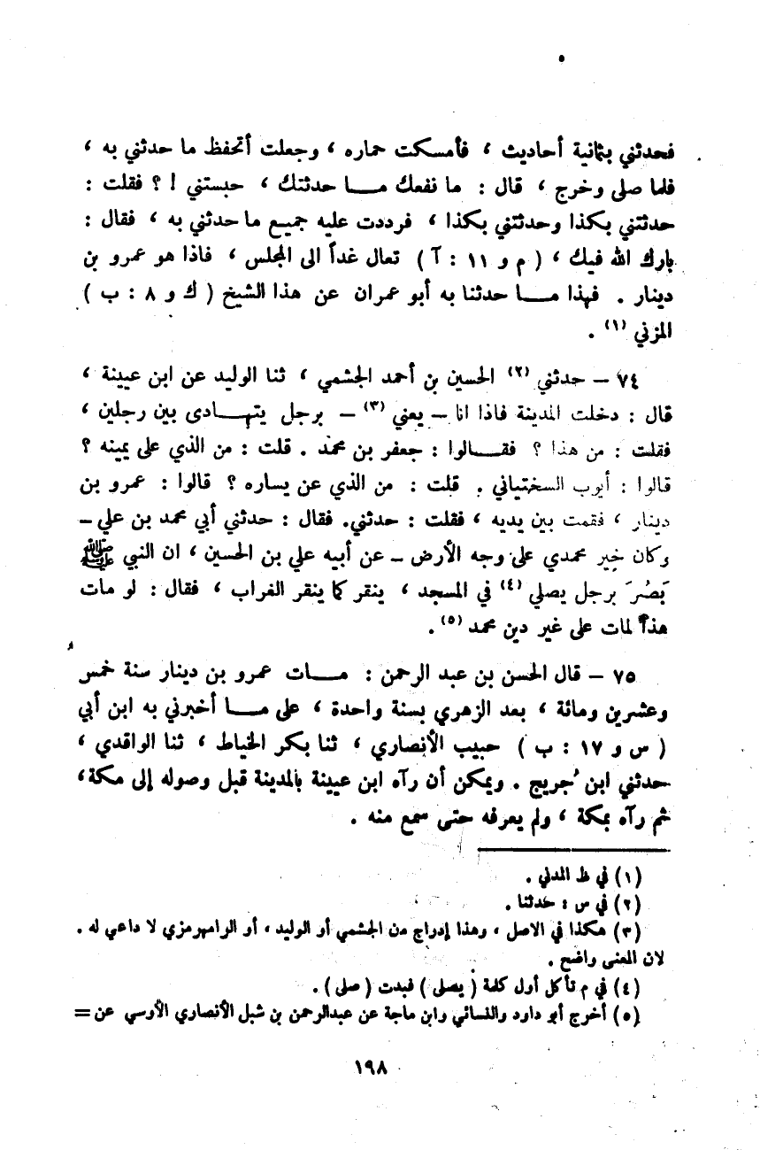 حَدَّثَنِي الْحُسَيْنُ بْنُ أَحْمَدَ الْجُشَمِيُّ، ثَنَا الْوَلِيدُ، عَنِ ابْنِ عُيَيْنَةَ قَالَ: دَخَلْتُ الْمَدِينَةَ فَإِذَا أَنَا يَعْنِي بِرَجُلٍ يَتَهَادَى بَيْنَ رَجُلَيْنٍ، فَقُلْتُ: مَنْ هَذَا؟ فَقَالُوا: جَعْفَرُ بْنُ مُحَمَّدٍ قُلْتُ: مَنِ الَّذِي عَلَى يَمِينِهِ؟ قَالُوا: أَيُّوبُ السَّخْتِيَانِيُّ قُلْتُ: مَنِ الَّذِي عَنْ يَسَارِهِ؟ قَالُوا: عَمْرُو بْنُ دِينَارٍ، فَقُمْتُ بَيْنَ يَدَيْهِ، فَقُلْتُ: حَدِّثْنِي فَقَالَ: حَدَّثَنِي أَبِي مُحَمَّدِ بْنُ عَلِيٍّ وَكَانَ خَيْرَ مُحَمَّدِي عَلَى وَجْهِ الْأَرْضِ، عَنْ أَبِيهِ عَلِيِّ بْنِ الْحُسَيْنِ، أَنَّ النَّبِيَّ صَلَّى اللهُ عَلَيْهِ وَسَلَّمَ §بَصُرَ بِرَجُلٍ يُصَلِّي فِي الْمَسْجِدِ، يُنْقَرُ كَمَا يُنْقَرُ الْغُرَابُ، فَقَالَ: «لَوْ مَاتَ هَذَا لَمَاتَ عَلَى غَيْرِ دِينِ مُحَمَّدٍ» قَالَ الْحَسَنُ بْنُ عَبْدِ الرَّحْمَنِ: مَاتَ عَمْرُو بْنُ دِينَارٍ سَنَةَ خَمْسٍ وَعِشْرِينَ وَمِائَةٍ، بَعْدَ الزُّهْرِيِّ بِسَنَةٍ وَاحِدَةٍ عَلَى مَا أَخْبَرَنِي بِهِ ابْنُ أَبِي حَبِيبٍ الْأَنْصَارِيُّ، ثَنَا بَكْرُ الْخَيَّاطُ، ثَنَا الْوَاقِدِيُّ حَدَّثَنِي ابْنُ جُرَيْجٍ وَيُمْكِنُ أَنْ رَآهُ ابْنُ عُيَيْنَةَ بِالْمَدِينَةِ قَبْلَ وُصُولِهِ إِلَى مَكَّةَ، ثُمَّ رَآهُ بِمَكَّةَ، وَلَمْ يَعْرِفْهُ حَتَّى سَمِعَ مِنْهُ