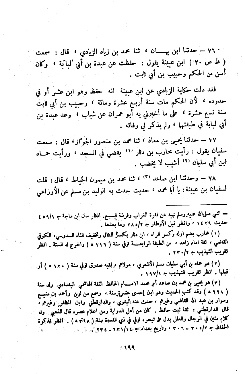حَدَّثَنَا ابْنُ بَهَانَ ثَنَا مُحَمَّدُ بْنُ زِيَادٍ الزِّيَادِيُّ قَالَ: سَمِعْتُ ابْنَ عُيَيْنَةَ يَقُولُ: «§حَفِظْتُ عَنْ عَبْدَةَ بْنِ أَبِي لُبَابَةَ، وَكَانَ أَسَنَّ مِنَ الْحَكَمِ وَحَبِيبِ بْنِ أَبِي ثَابِتٍ» فَقَدْ دَلَّتْ حِكَايَةُ الزِّيَادِيِّ، عَنِ ابْنِ عُيَيْنَةَ، أَنَّهُ حَفِظَ وَهُوَ ابْنُ عَشَرٍ أَوْ فِي حُدُودِهِ لِأَنَّ الْحَكَمَ مَاتَ سَنَةَ أَرْبَعَ عَشْرَةَ وَمِائَةٍ وَحَبِيبُ بْنُ أَبِي ثَابِتٍ سَنَةَ تِسْعَ عَشْرَةَ عَلَى مَا أَخْبَرَنِي بِهِ أَبُو عِمْرَانَ عَنْ شَبَابٍ وَعَدَّ عَبْدَةَ بْنَ أَبِي لُبَابَةَ فِي طَبَقَتِهِمَا، وَلَمْ يَذْكُرْ لِي وَفَاتَهُ