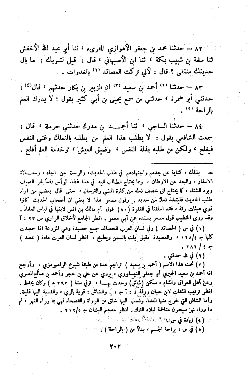 حَدَّثَنَا أَحْمَدُ بْنُ سَعِيدٍ أَنَّ الزُّبَيْرَ بْنَ بَكَّارٍ، حَدَّثَهُمْ قَالَ: حَدَّثَنِي أَبُو ضَمْرَةَ، حَدَّثَنِي مَنْ سَمِعَ يَحْيَى بْنَ أَبِي كَثِيرٍ، يَقُولُ: «§لَا يُدْرَكُ الْعِلْمُ بِالرَّاحَةِ»