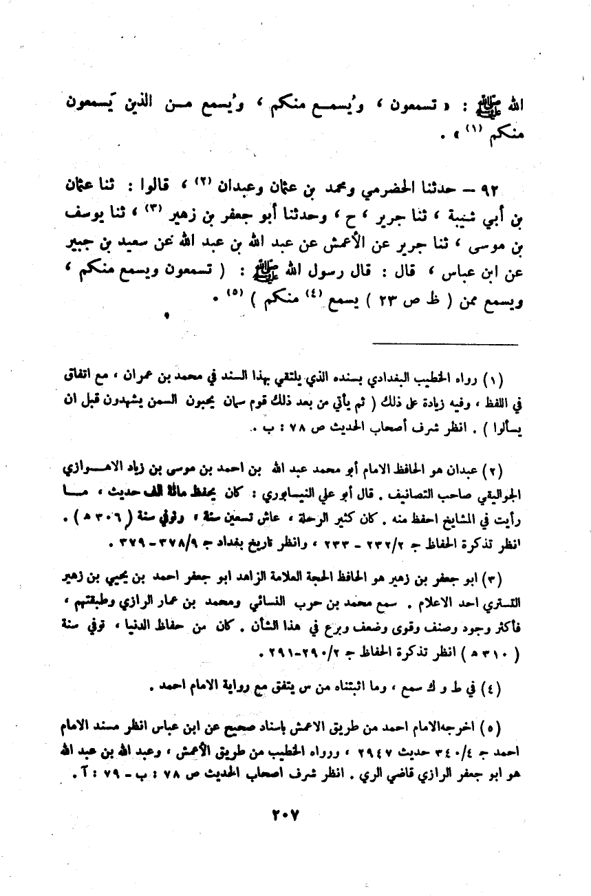 حَدَّثَنَا الْحَضْرَمِيُّ، وَمُحَمَّدُ بْنُ عُثْمَانَ، وَعَبْدَانُ قَالُوا: ثَنَا عُثْمَانُ بْنُ أَبِي شَيْبَةَ، ثَنَا جَرِيرٌ ح وَحَدَّثَنَا أَبُو جَعْفَرِ بْنُ زُهَيْرٍ، ثَنَا يُوسُفُ بْنُ مُوسَى، ثَنَا جَرِيرٌ، عَنِ الْأَعْمَشِ، عَنْ عَبْدِ اللَّهِ بْنِ عَبْدِ اللَّهِ، عَنْ سَعِيدِ بْنِ جُبَيْرٍ، عَنِ ابْنِ عَبَّاسٍ قَالَ: قَالَ رَسُولُ اللَّهِ صَلَّى اللهُ عَلَيْهِ وَسَلَّمَ: «§تَسْمَعُونَ وَيُسْمَعُ مِنْكُمْ، وَيُسْمَعُ مِمَّنْ يَسْمَعُ مِنْكُمْ»