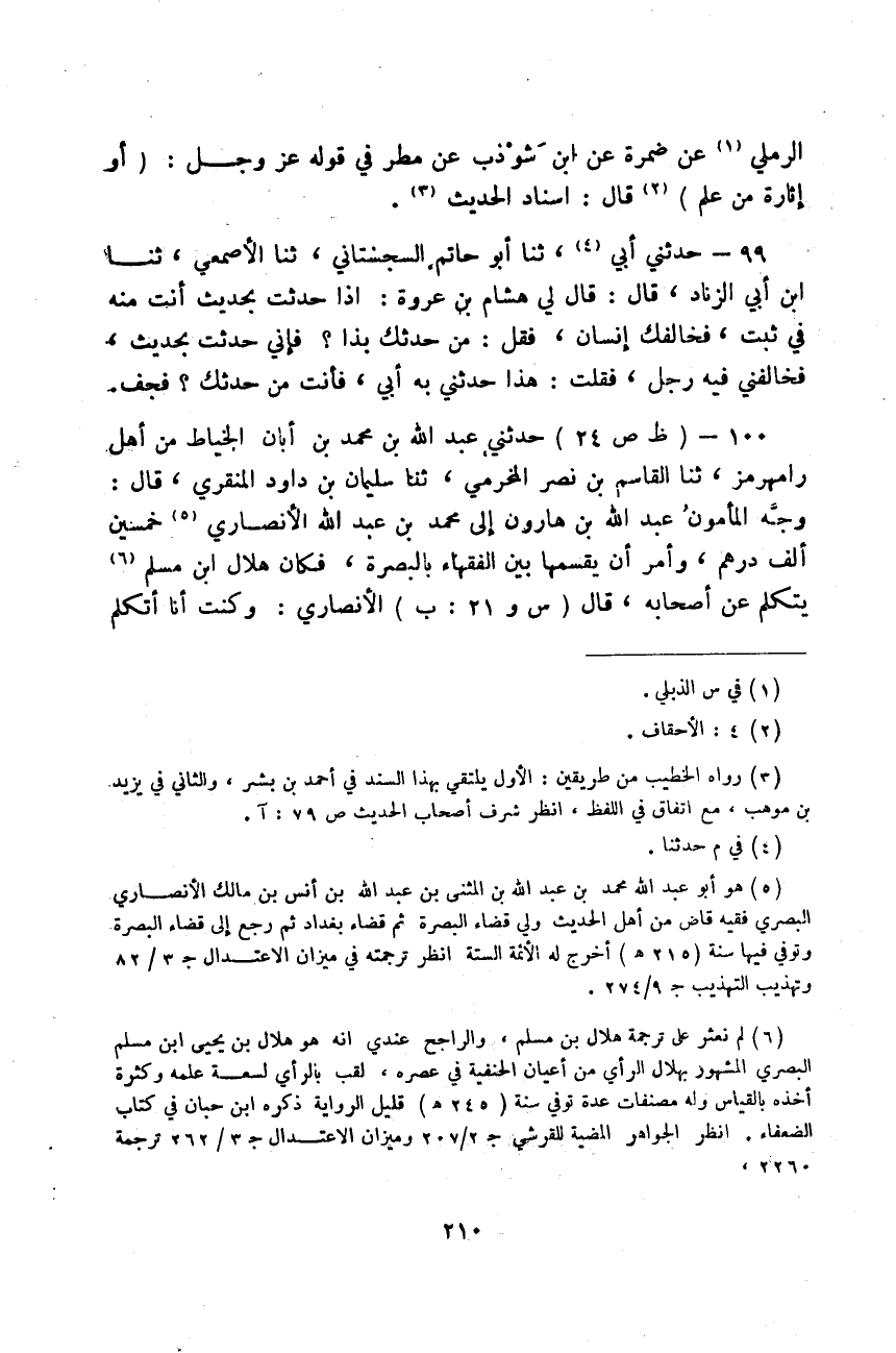 حَدَّثَنِي عَبْدُ اللَّهِ بْنُ مُحَمَّدِ بْنِ أَبَانَ الْخَيَّاطُ، مِنْ أَهْلِ رَامَهُرْمُزَ، ثَنَا الْقَاسِمُ بْنُ نَصْرٍ الْمُخَرِّمِيُّ، ثَنَا سُلَيْمَانُ بْنُ دَاوُدَ الْمِنْقَرِيُّ، قَالَ: وَجَّهَ الْمَأْمُونُ عَبْدَ اللَّهِ بْنَ هَارُونَ إِلَى مُحَمَّدِ بْنِ عَبْدِ اللَّهِ الْأَنْصَارِيِّ خَمْسِينَ أَلْفَ دِرْهَمٍ، وَأَمَرَ أَنْ يَقْسِمَهَا بَيْنَ الْفُقَهَاءِ بِالْبَصْرَةِ، فَكَانَ هِلَالُ بْنُ مُسْلِمٍ يَتَكَلَّمُ عَنْ أَصْحَابِهِ، قَالَ الْأَنْصَارِيُّ: وَكُنْتُ أَنَا أَتَكَلَّمُ