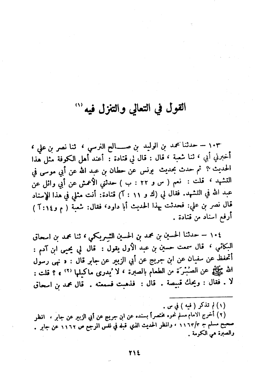 حَدَّثَنَا مُحَمَّدُ بْنُ الْوَلِيدِ بْنِ صَالِحٍ النُّرْسِيُّ، ثَنَا نَصْرُ بْنُ عَلِيٍّ، أَخْبَرَنِي أَبِي، ثَنَا شُعْبَةُ، قَالَ: قَالَ لِي قَتَادَةُ: أَعِنْدَ أَهْلِ الْكُوفَةِ مِثْلُ هَذَا الْحَدِيثِ؟ ثُمَّ حَدَّثَ بِحَدِيثِ يُونُسَ، عَنْ حِطَّانَ بْنِ عَبْدِ اللَّهِ، عَنْ أَبِي مُوسَى §فِي التَّشَهُّدِ، قُلْتُ: نَعَمْ، حَدَّثَنِي الْأَعْمَشُ، عَنْ أَبِي وَائِلٍ، عَنْ عَبْدِ اللَّهِ فِي التَّشَهُّدِ، فَقَالَ لِي قَتَادَةُ: أَنْتَ مِثْلِي فِي هَذَا الْإِسْنَادِ. قَالَ نَصْرُ بْنُ عَلِيٍّ: فَحَدَّثْتُ بِهَذَا الْحَدِيثِ أَبَا دَاوُدَ فَقَالَ: «شُعْبَةُ أَرْفَعُ إِسْنَادًا مِنْ قَتَادَةَ»