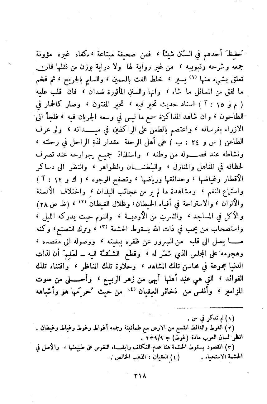 حَفِظَ أَحَدُهُمْ فِي السُّنَنِ شَيْئًا، فَمِنْ صَحِيفَةٍ مُبْتَاعَةٍ، كَفَاهُ غَيْرُهُ مُؤْنَةَ جَمْعِهِ وَشَرْحِهِ وَتَبْوِيبِهِ، مِنْ غَيْرِ رِوَايَةٍ لَهَا وَلَا دِرَايَةٍ بِوَزْنٍ مِنْ نَقْلِهَا فَإِنْ تَعَلَّقَ بِشَيْءٍ مِنْهَا يَسِيرُ، خَلَطَ الْغَثَّ بِالسَّمِينِ، وَالسَّلِيمِ بِالْجَرِيحِ، ثُمَّ فَخَّمَ مَا لَفَّقَ مِنَ الْمَسَائِلِ مَا شَاءَ، وَإِنَّهَا وَالسُّنَنَ الْمَأْثُورَةِ ضِدَّانِ، فَإِنْ قُلِبَ عَلَيْهِ إِسْنَادُ حَدِيثٍ تَحَيَّرَ فِيهِ تَحَيُّرَ الْمَفْتُونِ، وَصَارَ كَالْحِمَارِ فِي الطَّاحُونِ، وَإِنْ شَاهِدَ الْمُذَاكَرَةَ سَمِعَ مَا لَيْسَ فِي وُسْعِهِ الْجَرَيَانِ فِيهِ، فَلَجَأَ إِلَى الْإِزْرَاءِ بِفُرْسَانِهِ، وَاعْتَصَمَ بِالطَّعْنِ عَلَى الرَّاكِضِينَ فِي مَيْدَانِهِ، وَلَوْ عَرَفَ الطَّاعِنُ عَلَى أَهْلِ الرِّحْلَةِ مِقْدَارَ لَذَّةِ الرَّاحِلِ فِي رِحْلَتِهِ، وَنَشَاطَهُ عِنْدَ فُصُولِهِ مِنْ وَطَنِهِ، وَاسْتِلْذَاذَ جَمِيعِ جَوَارِحِهِ عِنْدَ تَصَرُّفِ لَحَظَاتِهِ فِي الْمَنَاهِلِ وَالْمَنَازِلِ، وَالْبُطْنَانِ وَالظَّوَاهِرُ، وَالنَّظَرُ إِلَى دَسَاكِرِ الْأَقْطَارِ وَغِيَاضِهَا، وَحَدَائِقِهَا وَرِيَاضِهَا، وَتَصَفُّحُ الْوُجُوهِ، وَاسْتِمَاعُ النَّغَمْ، وَمُشَاهَدةُ مَا لَمْ يُرَ مِنْ عَجَائِبِ الْبُلْدَانِ، وَاخْتِلَافِ الْأَلْسِنَةِ وَالْأَلْوَانِ، وَالِاسْتِرَاحَةِ فِي أَفْيَاءِ الْحِيطَانِ، وَظِلَالِ الْغِيطَانِ، وَالْأَكْلُ فِي الْمَسَاجِدِ، وَالشُّرْبُ مِنَ الْأَدْوِيَةِ، وَالنَّوْمُ حَيْثُ يُدْرِكُهُ اللَّيْلُ، وَاسْتِصْحَابُ مَنْ يُحِبُّ فِي ذَاتِ اللَّهِ بِسُقُوطِ الْحِشْمَةِ، وَتَرْكِ التَّصَنُّعِ، وَكُنْهَ مَا يَصِلُ إِلَى قَلْبِهِ مِنَ السُّرُورِ عَنْ ظَفَرِهِ بِبُغْيَتِهِ، وَوُصُولِهِ إِلَى مَقْصَدِهِ، وَهُجُومِهِ عَلَى الْمَجْلِسِ الَّذِي شَمَّرَ لَهُ، وَقَطَعَ الشُّقَّةَ إِلَيْهِ لَعِلْمِ أَنَّ لَذَّاتِ الدُّنْيَا مَجْمُوعَةٌ فِي مَحَاسِنِ تِلْكَ الْمَشَاهِدِ، وَحَلَاوَةِ تِلْكَ الْمَنَاظِرِ، وَاقْتِنَاءِ تِلْكَ الْفَوَائِدِ، الَّتِي هِيَ عِنْدَ أَهْلِهَا أَبْهَى مِنْ زَهْرِ الرَّبِيعِ، وَأَحْلَى مِنْ صَوْتِ الْمَزَامِيرِ، وَأَنْفَسُ مِنْ ذَخَائِرِ الْعِقْيَانِ، مِنْ حَيْثُ حُرِمَهَا هُوَ وَأَشْبَاهُهُ