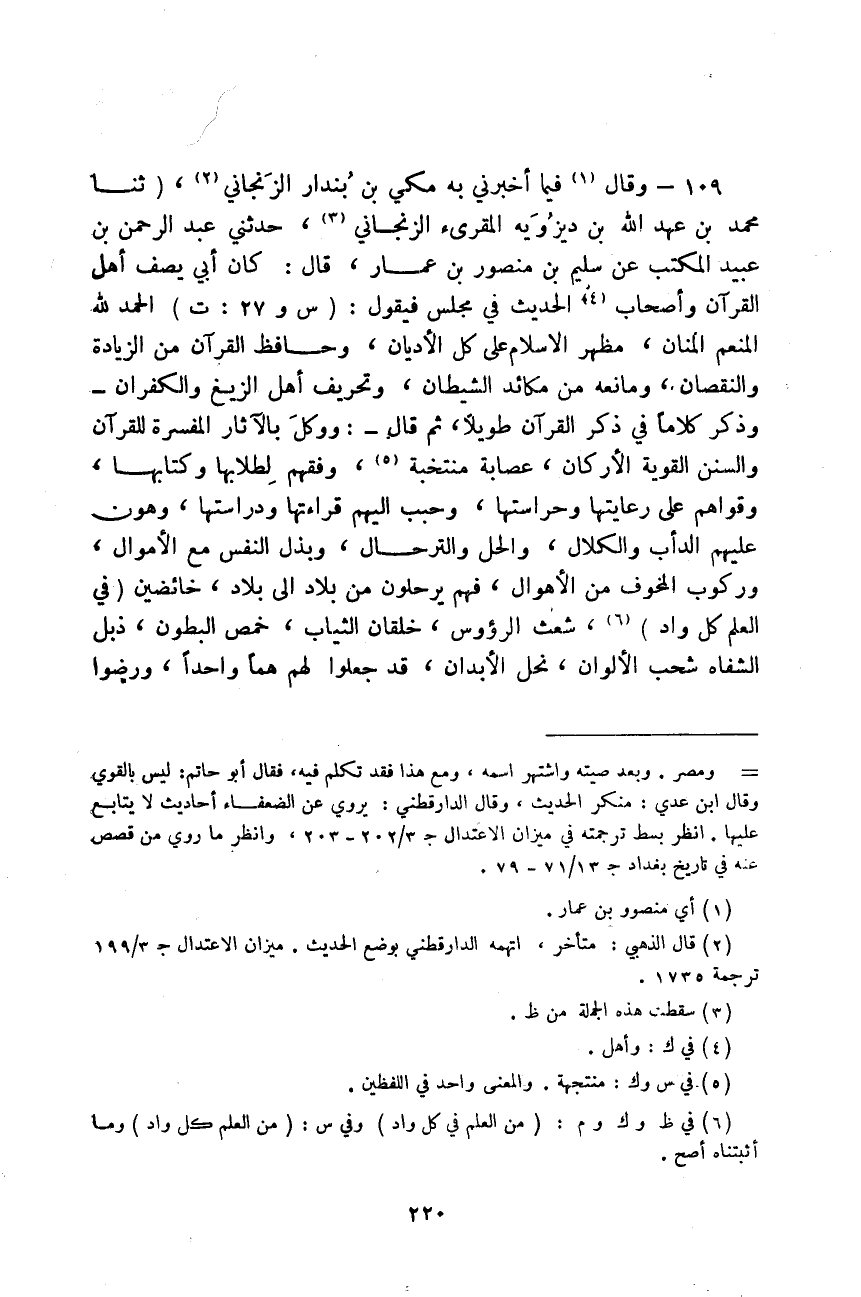 وَقَالَ فِيمَا أَخْبَرَنِي بِهِ مَكِّيُّ بْنُ بُنْدَارٍ الزَّنْجَانِيُّ، ثَنَا مُحَمَّدُ بْنُ عَهْدِ اللَّهِ بْنِ دِيزُوَيهِ الْمُقْرِئُ الزَّنْجَانِيُّ، حَدَّثَنِي عَبْدُ الرَّحْمَنِ بْنُ عُبَيْدٍ الْمُكْتِبُ، عَنْ سُلَيْمِ بْنِ مَنْصُورِ بْنِ عَمَّارٍ قَالَ: كَانَ §أَبِي يَصِفُ أَهْلَ الْقُرْآنِ، وَأَصْحَابَ الْحَدِيثِ فِي مَجْلِسٍ فَيَقُولُ: " الْحَمْدُ لِلَّهِ الْمُنْعِمُ الْمَنَّانُ، مُظْهِرُ الْإِسْلَامَ عَلَى كُلِّ الْأَدْيَانِ، وَحَافَظَ الْقُرْآنِ مِنَ الزِّيَادَةِ وَالنُّقْصَانِ، وَمَانِعَهُ مِنْ مَكَائِدِ الشَّيْطَانِ، وَتَحْرِيفِ أَهْلِ الزَّيْغِ وَالْكُفْرَانِ، وَذَكَرَ كَلَامًا فِي ذِكْرِ الْقُرْآنِ طَوِيلًا، ثُمَّ قَالَ: وَوَكَلَ بِالْآثَارِ الْمُفَسِّرَةِ لِلْقُرْآنِ وَالسُّنَنِ الْقَوِيَّةِ الْأَرْكَانِ، عِصَابَةً مُنْتَخِبَةً، وَفَّقَهُمْ لِطَلَابِهَا وَكِتَابِهَا، وَقَوَّاهُمْ عَلَى رِعَايَتِهَا وَحِرَاسَتِهَا، وَحَبَّبَ إِلَيْهِمْ قِرَاءَتَهَا وَدِرَاسَتَهَا، وَهَوَّنْ عَلَيْهِمُ الدَّأَبَ وَالْكَلَالَ، وَالْحِلَّ وَالتِّرْحَالَ، وَبَذْلَ النَّفْسِ مَعَ الْأَمْوَالِ، وَرُكُوبَ الْمَخُوفِ مِنَ الْأَهْوَالِ، فَهُمْ يَرْحَلُونَ مِنْ بِلَادٍ إِلَى بِلَادٍ، خَائِضِينَ فِي الْعِلْمِ كُلَّ وَادٍ، شُعْثَ الرُّءُوسِ، خُلْقَانَ الثِّيَابِ، خُمُصَ الْبُطُونِ، ذُبُلَ الشِّفَاهِ، شُحْبَ الْأَلْوَانِ، نُحْلَ الْأَبْدَانِ، قَدْ جَعَلُوا لَهُمْ هَمًّا وَاحِدًا، وَرَضُوا