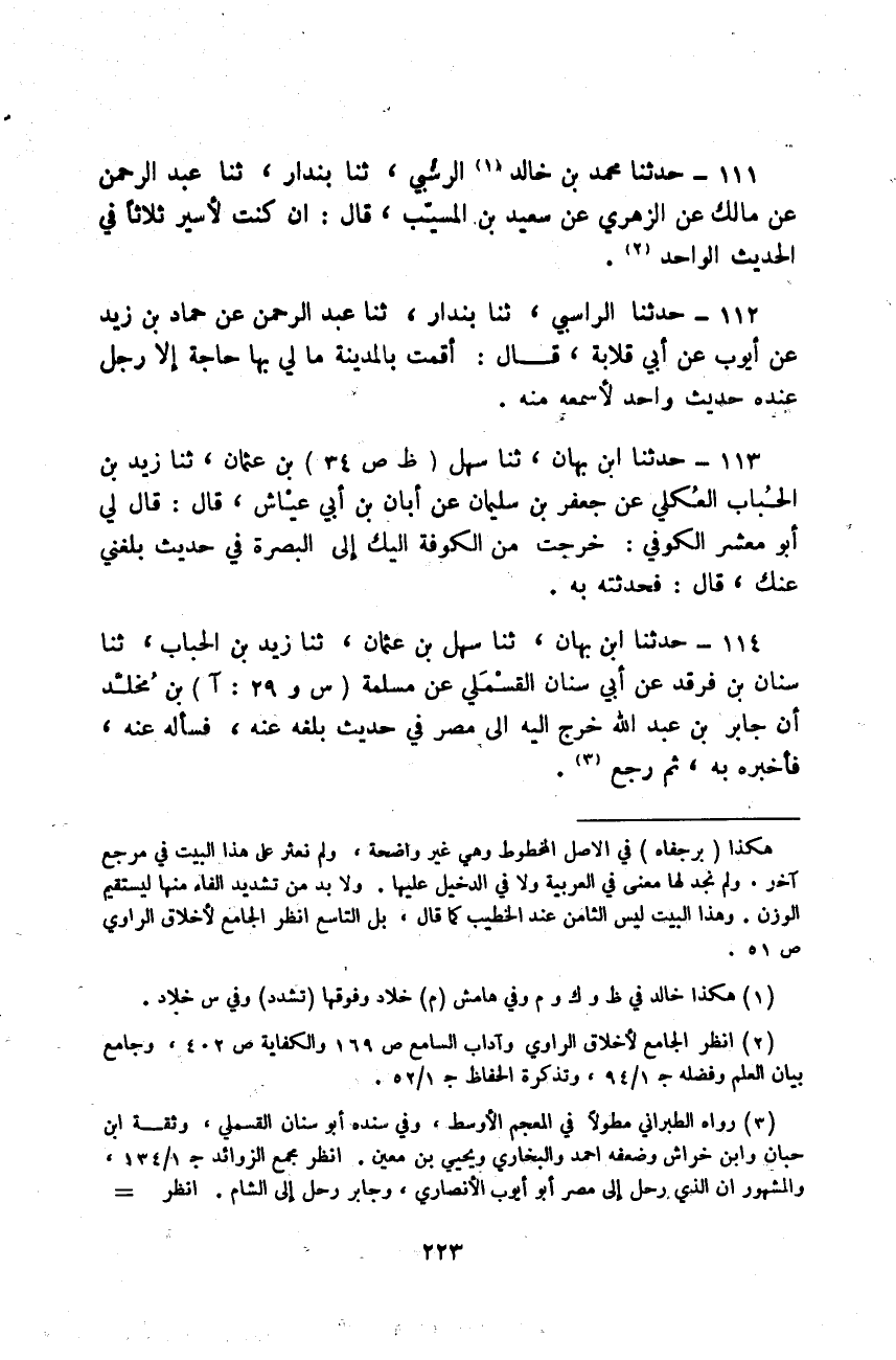 حَدَّثَنَا مُحَمَّدُ بْنُ خَالِدٍ الرَّاسِبِيُّ، ثَنَا بُنْدَارٌ، ثَنَا عَبْدُ الرَّحْمَنِ، عَنْ مَالِكٍ، عَنِ الزُّهْرِيِّ، عَنْ سَعِيدِ بْنِ الْمُسَيِّبِ قَالَ: «إِنْ كُنْتَ §لَأَسِيرُ ثَلَاثًا فِي الْحَدِيثِ الْوَاحِدِ»