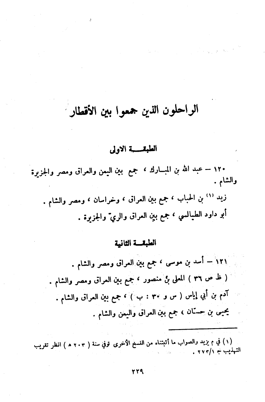 §الطَّبَقَةُ الْأُولَى عَبْدُ اللَّهِ بْنُ الْمُبَارَكِ، جَمَعَ بَيْنَ الْيَمَنِ وَالْعِرَاقِ وَمِصْرَ وَالْجَزِيرَةِ وَالشَّامِ زَيْدُ بْنُ الْحُبَابِ، جَمَعَ بَيْنَ الْعِرَاقِ، وَخُرَاسَانَ، وَمِصْرَ وَالشَّامِ أَبُو دَاوُدَ الطَّيَالِسِيُّ، جَمَعَ بَيْنَ الْعِرَاقِ وَالرَّيِّ وَالْجَزِيرَةِ