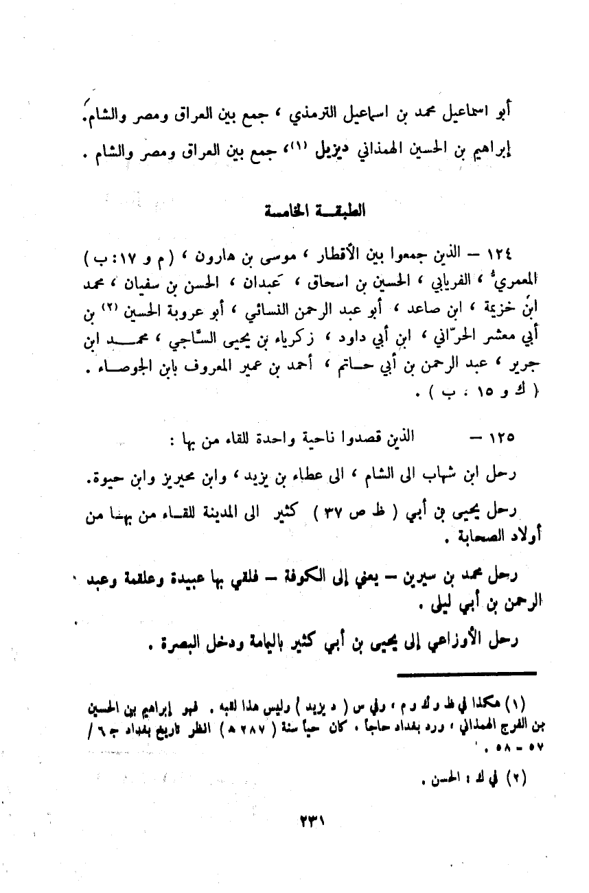 §الَّذِينَ قَصَدُوا نَاحِيَةً وَاحِدَةً لِلِقَاءِ مَنْ بِهَا رَحَلَ ابْنُ شِهَابٍ إِلَى الشَّامِ، إِلَى عَطَاءِ بْنِ يَزِيدَ، وَابْنِ مُحَيْرِيزٍ وَابْنِ حَيْوَةَ رَحَلَ يَحْيَى بْنُ أَبِي كَثِيرٍ إِلَى الْمَدِينَةِ لِلِقَاءِ مَنْ بِهَا مِنْ أَوْلَادِ الصَّحَابَةِ رَحَلَ مُحَمَّدُ بْنُ سِيرِينَ يَعْنِي إِلَى الْكُوفَةِ، فَلَقِيَ بِهَا عُبَيْدَةَ وَعَلْقَمَةَ وَعَبْدَ الرَّحْمَنِ بْنَ أَبِي لَيْلَى رَحَلَ الْأَوْزَاعِيُّ إِلَى يَحْيَى بْنِ أَبِي كَثِيرٍ بِالْيَمَامَةِ وَدَخَلَ الْبَصْرَةَ