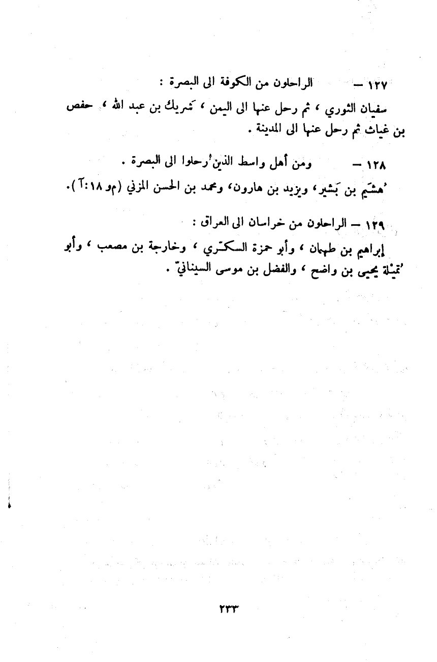 §الرَّاحِلُونَ مِنَ الْكُوفَةِ إِلَى الْبَصْرَةِ سُفْيَانُ الثَّوْرِيُّ، ثُمَّ رَحَلَ عَنْهَا إِلَى الْيَمَنِ، شَرِيكُ بْنُ عَبْدِ اللَّهِ، حَفْصُ بْنُ غِيَاثٍ، ثُمَّ رَحَلَ عَنْهَا إِلَى الْمَدِينَةِ