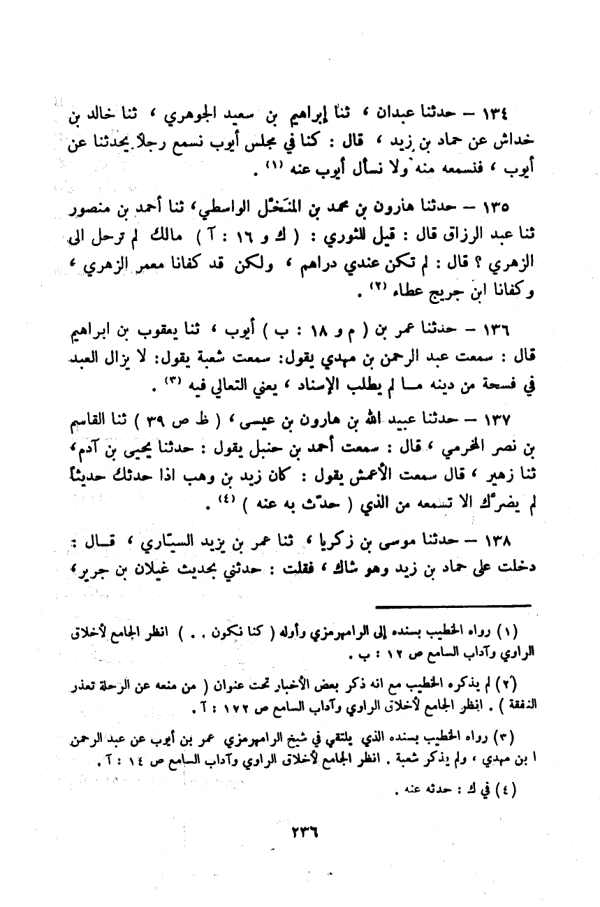 حَدَّثَنَا عَبْدَانُ، ثَنَا إِبْرَاهِيمُ بْنُ سَعِيدٍ الْجَوْهَرِيُّ، ثَنَا خَالِدُ بْنُ خِدَاشٍ، عَنْ حَمَّادِ بْنِ زَيْدٍ قَالَ: «§كُنَّا فِي مَجْلِسِ أَيُّوبَ نَسْمَعُ رَجُلًا يُحَدِّثُنَا عَنْ أَيُّوبَ، فَنَسْمَعُهُ مِنْهُ، وَلَا نَسْأَلُ أَيُّوبَ عَنْهُ»